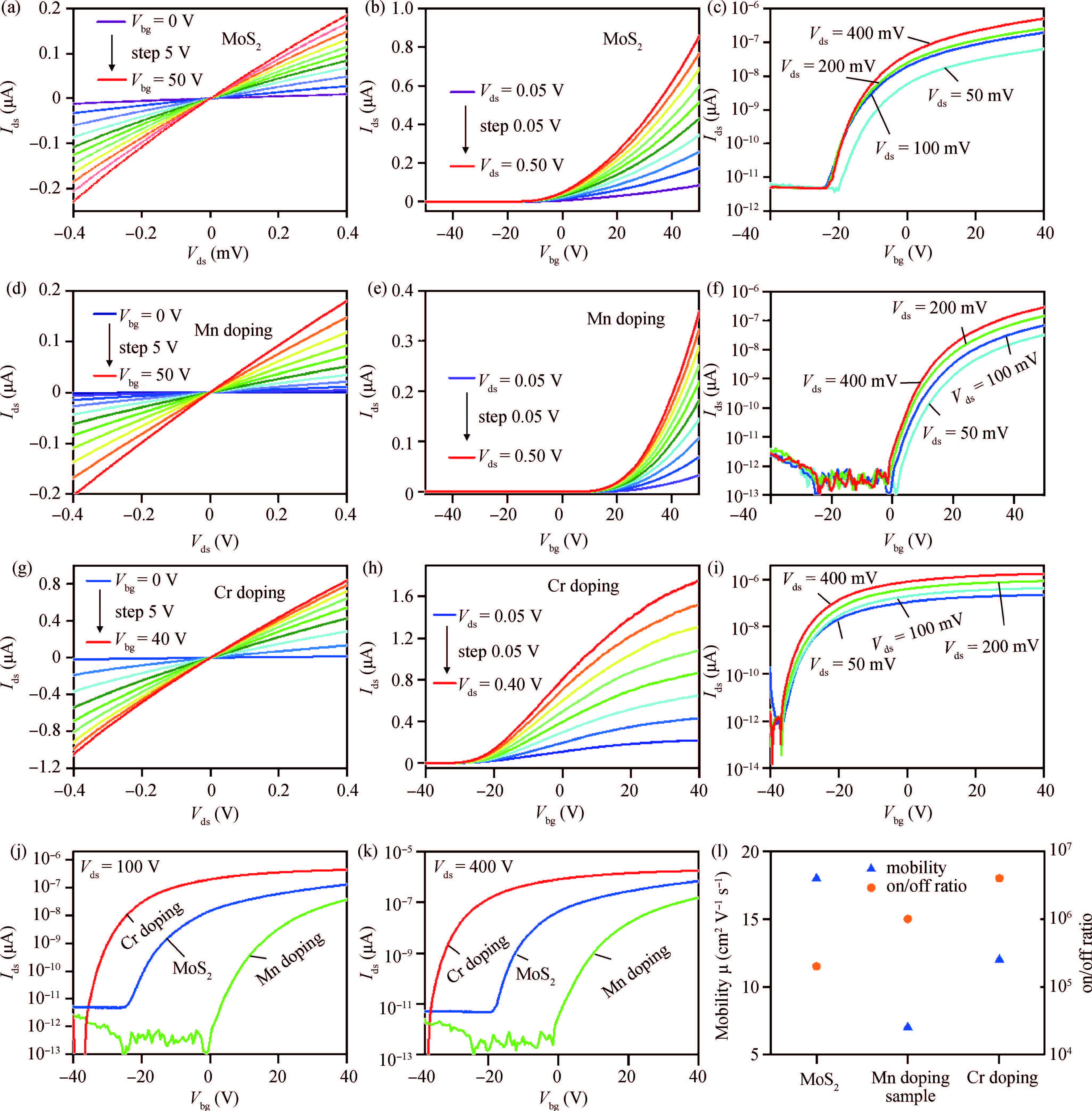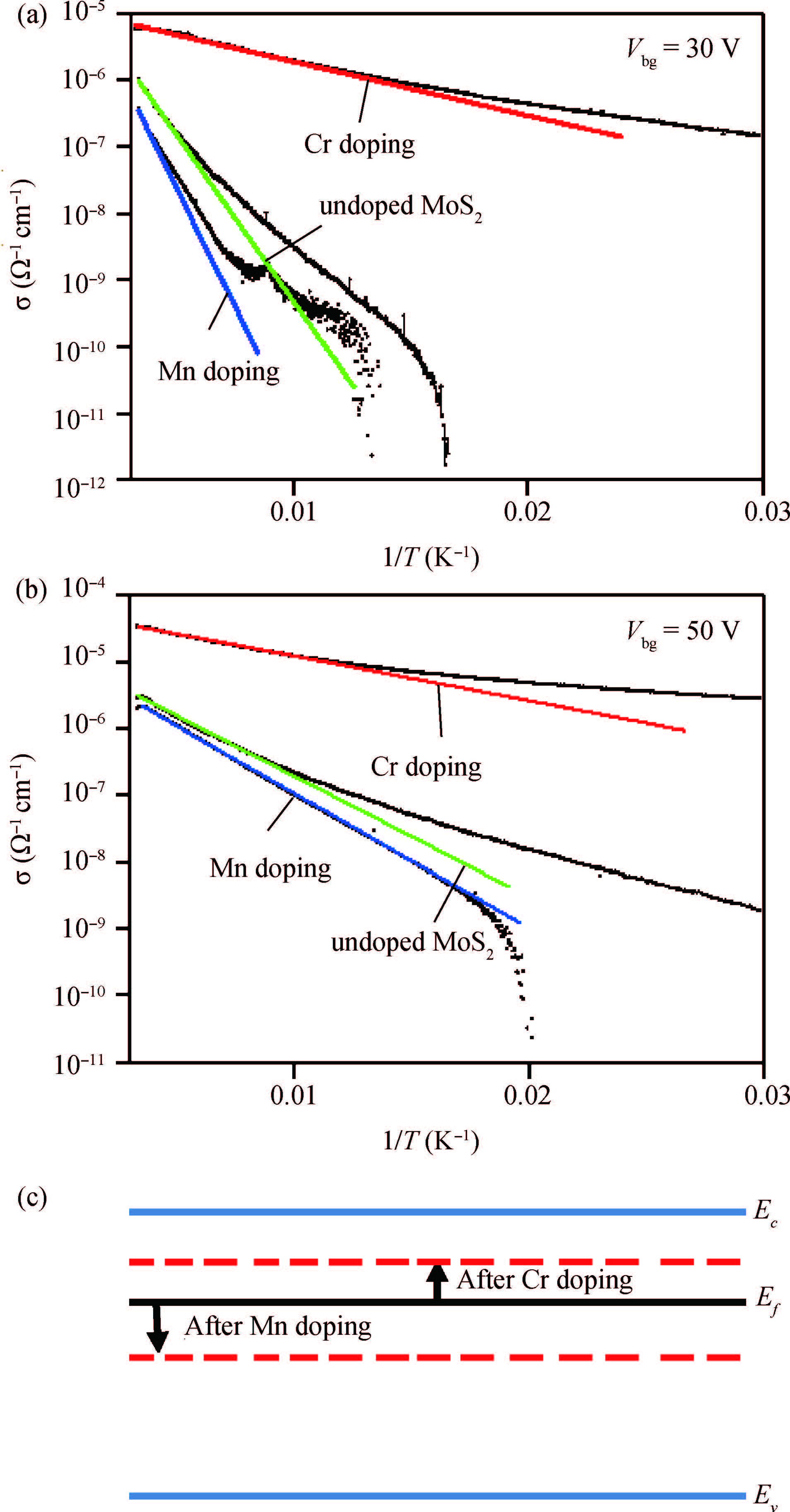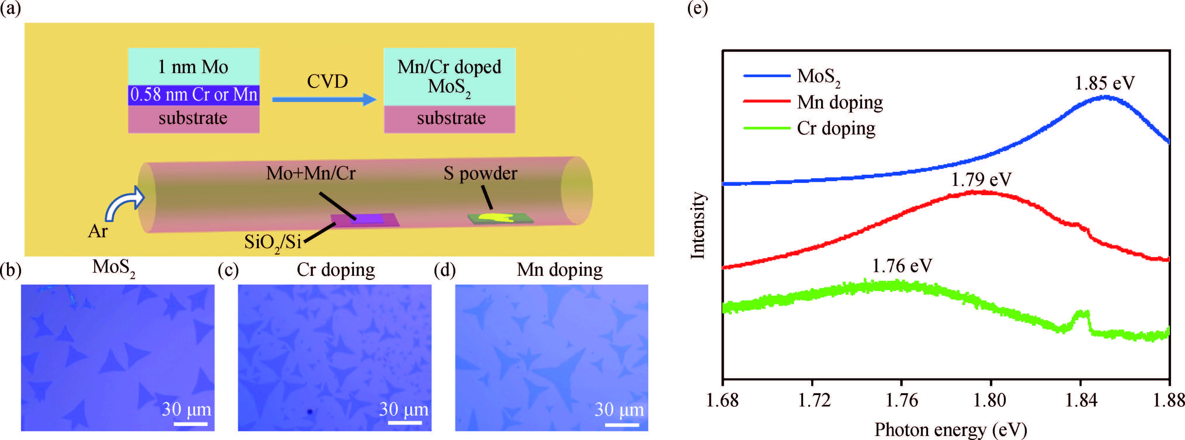 Abstract: Recently, two-dimensional materials have been attracting increasing attention because of their novel properties and promising applications. However, the impurity doping remains a significant challenge owing to the lack of the doping strategy in the atomically thin layers. Here we report on the chromium (Cr) and manganese (Mn) doping in atomically-thin MoS2 crystals grown by chemical vapor deposition. The Cr/Mn doped MoS2 samples are characterized by a peak at 1.76 and 1.79 eV in photoluminescence spectra, respectively, compared with the undoped one at 1.85 eV. The field-effect transistor (FET) devices based on the Mn doping show a higher threshold voltage than that of the pure MoS2 while the Cr doping exhibits the opposite behavior. Importantly, the carrier concentration in these samples displays a remarkable difference arising from the doping effect, consistent with the evolution of the FET performance. The temperature-dependent conductivity measurements further demonstrate a large variation in activation energy. The successful incorporation of the Mn and Cr impurities into the monolayer MoS2 paves the way towards the high Curie temperature two-dimensional dilute magnetic semiconductors.