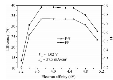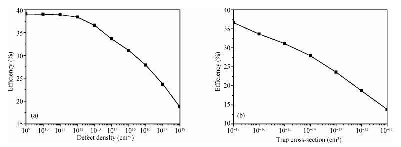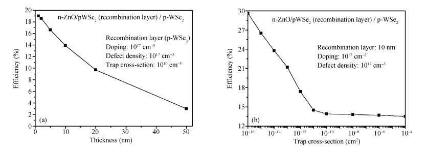 Abstract: Taking into account defect density in WSe2, interface recombination between ZnO and WSe2, we presented a simulation study of ZnO/crystalline WSe2 heterojunction (HJ) solar cell using wxAMPS simulation software. The optimal conversion efficiency 39.07% for n-ZnO/p-c-WSe2 HJ solar cell can be realized without considering the impact of defects. High defect density (> 1.0 × 1011 cm-2) in c-WSe2 and large trap cross-section (> 1.0 × 10-10 cm2) have serious impact on solar cell efficiency. A thin p-WSe2 layer is intentionally inserted between ZnO layer and c-WSe2 to investigate the effect of the interface recombination. The interface properties are very crucial to the performance of ZnO/c-WSe2HJ solar cell. The affinity of ZnO value range between 3.7-4.5 eV gives the best conversion efficiency.