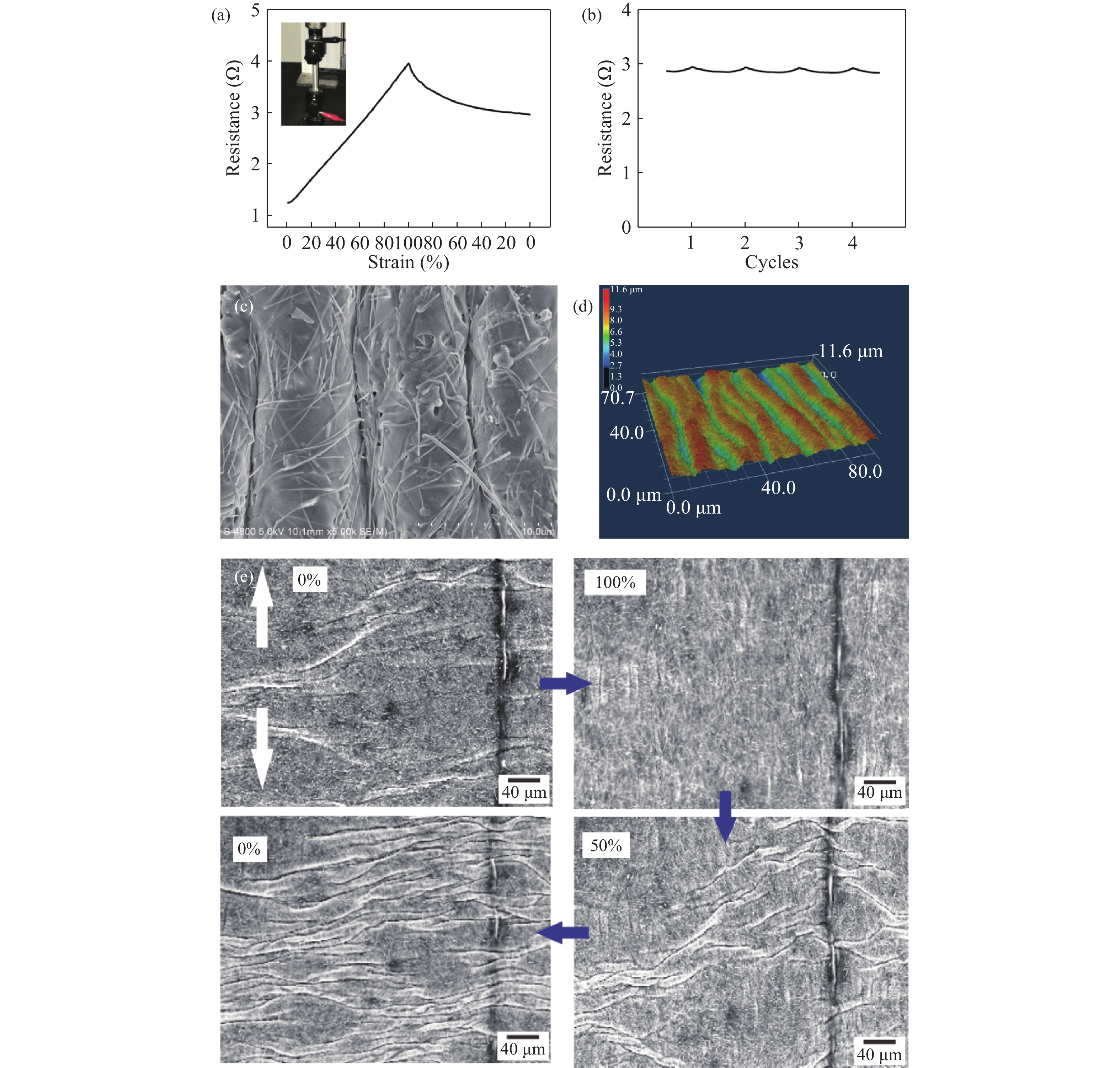 Abstract: In this paper, a flexible and stretchable circuit has been fabricated by the printing method based on Ag NWs/PDMS composite. The randomly oriented Ag NWs were buried in PDMS to form a conductive and stretchable electrode. Stable conductivity was achieved with a large range of tensile strain (0–50%) after the initial stretching/releasing cycle. The stable electrical response is due to the buckling of the Ag NWs/PDMS composite layer. Furthermore, printed stretchable circuits integrated with commercial ICs have been demonstrated for wearable applications.