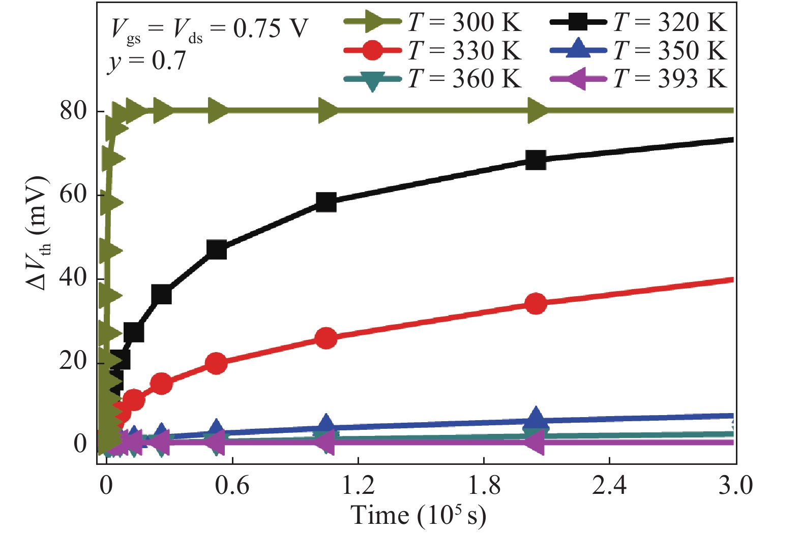 Fig. 10.  (Color online) Shift in ΔVth at different temperature levels with time.