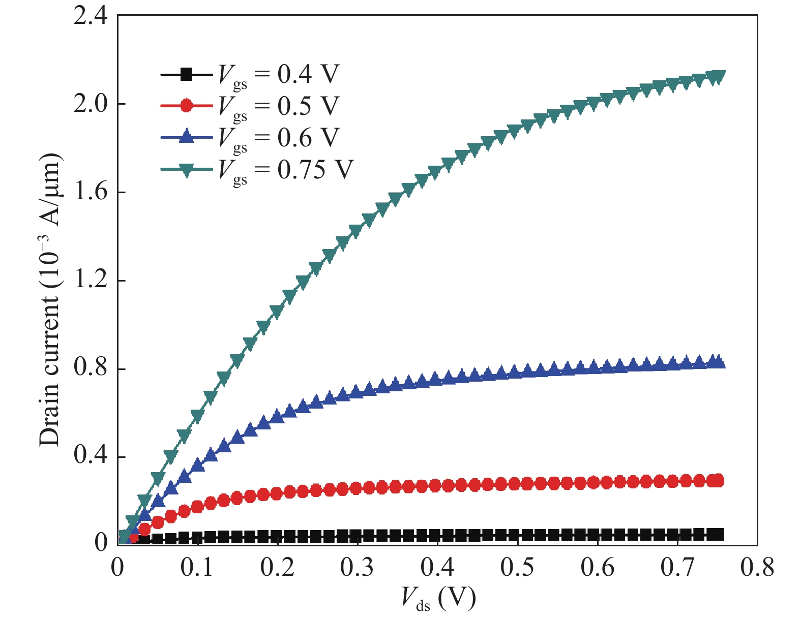 Fig. 2.  (Color online) Variation in Id with respect to Vgs at Vds = 0.75 V for different values of y in Si1?yCy.