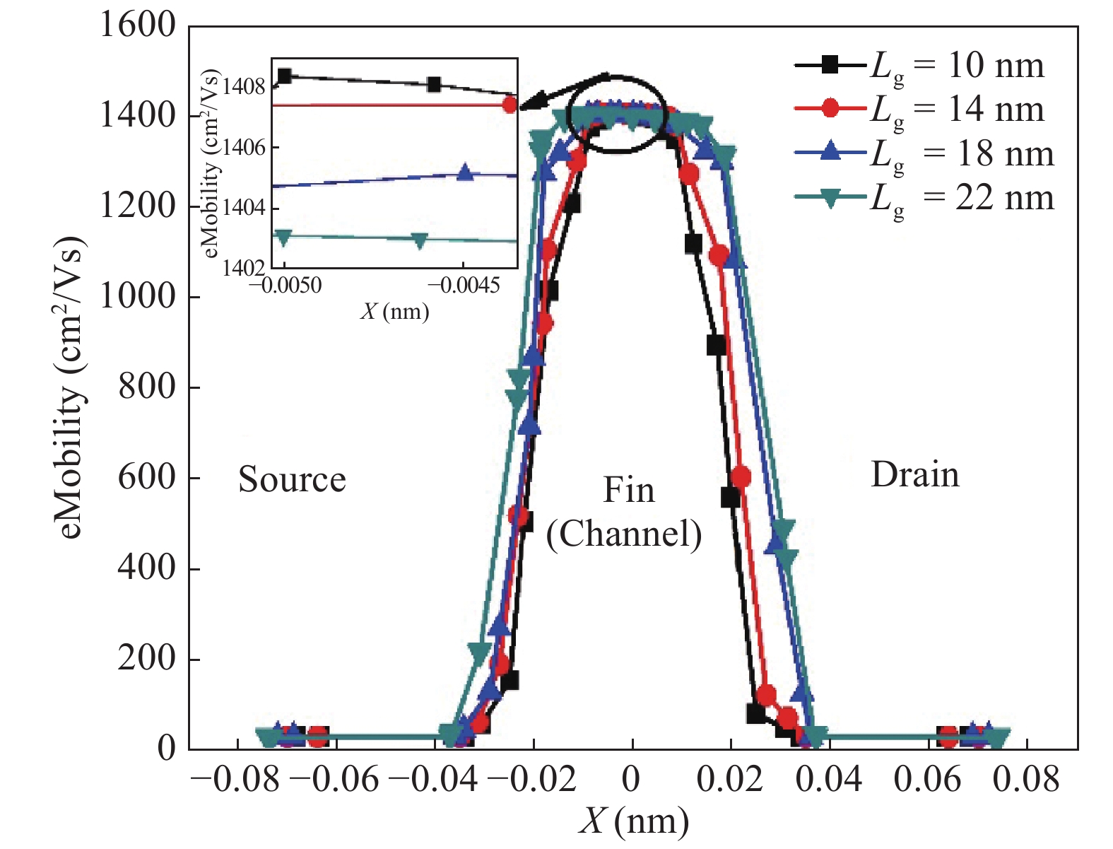 Fig. 5.  (Color online) eMobility at the centre of the channel for gate lengths (Lg) 10, 14, 18, and 22 nm at constant fin width.