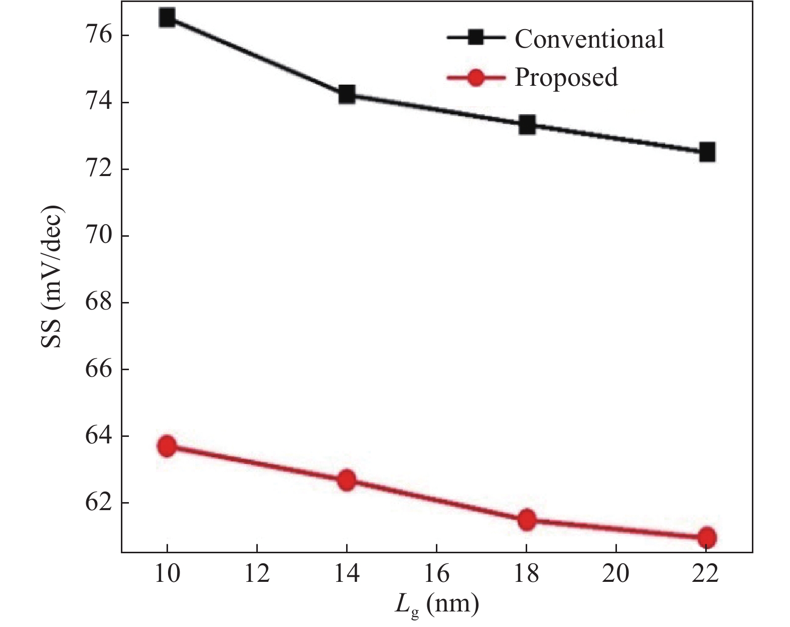 Fig. 7.  (Color online) Change in subthreshold swing (SS) at different gate lengths (Lg).