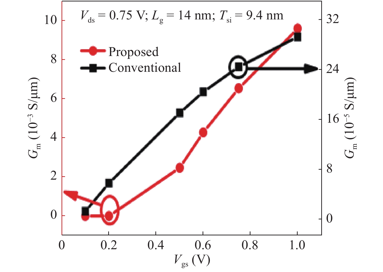 Fig. 8.  (Color online) Variation of Gm with Vgs for the proposed and Si S/D conventional FinFETs.