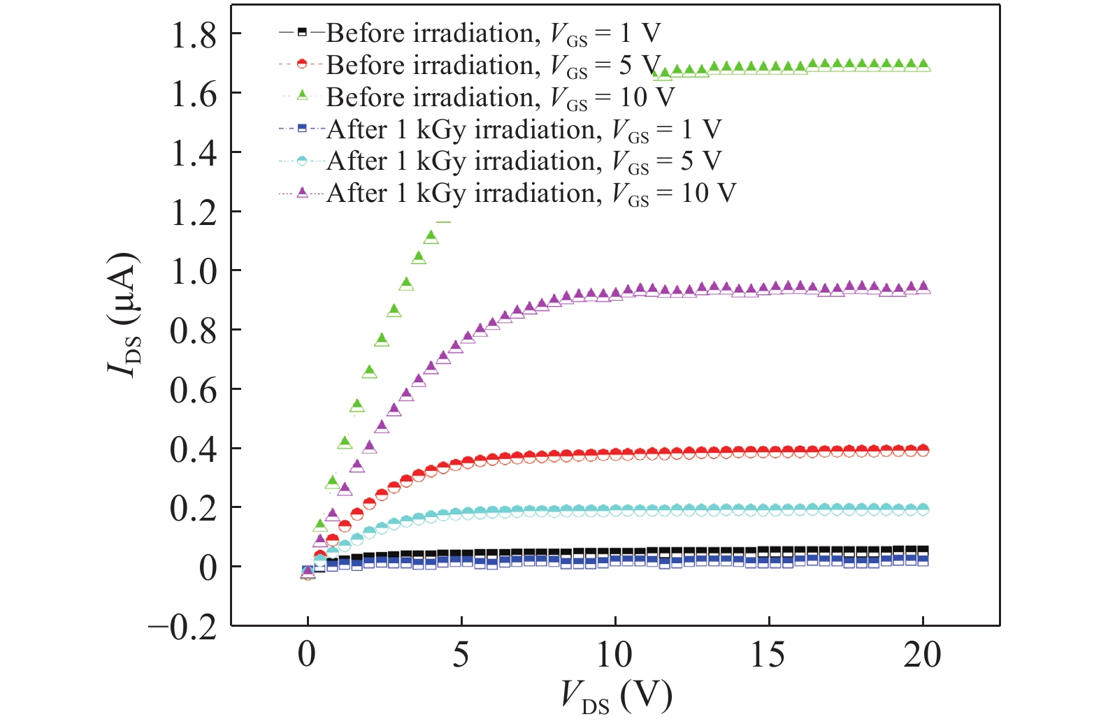 Fig. 5.  (Color online) Effect of irradiation on sample before and after irradiation of 1 kGy at VGS = 1, 5, 10 V.