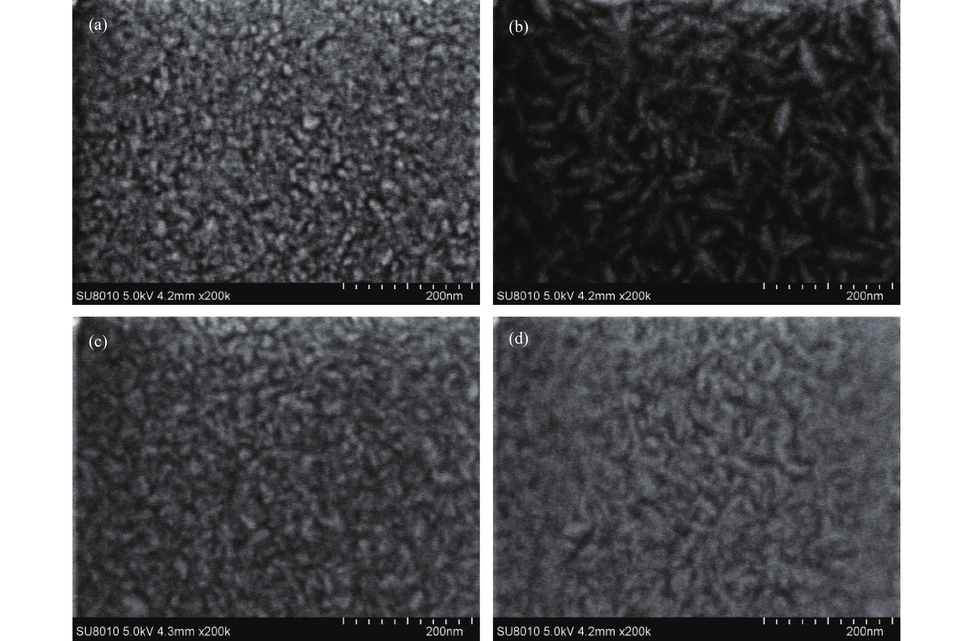Fig. 3.  Surface morphology of AZO films grown at different temperatures: (a) 100 °C, (b) 150 °C, (c) 200 °C, and (d) 250 °C.