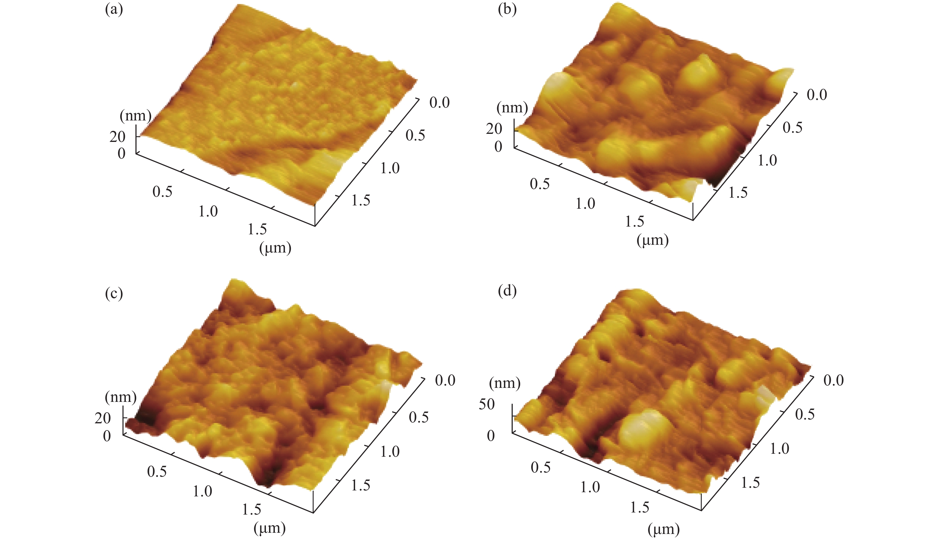 Fig. 4.  (Color online) 2 × 2 μm2 AFM scan images of AZO films as a function of Zn : Al cycle ratio. (a) 20 : 0. (b) 20 : 1. (c) 20 : 2. (d) 20 : 3.