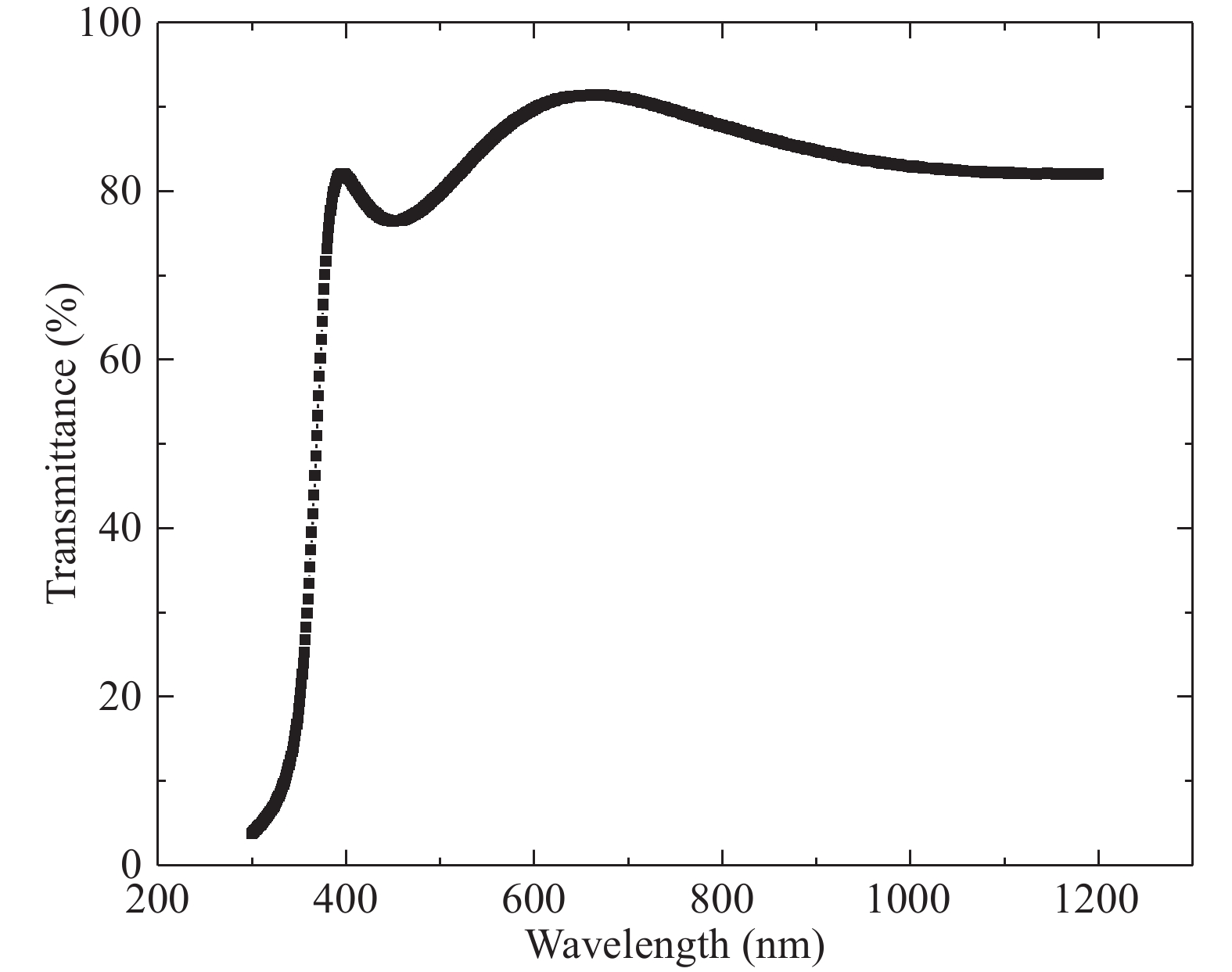 Fig. 7.  Optical transmittance spectrum of AZO film with 20 : 2 Zn : Al cycle ratio.