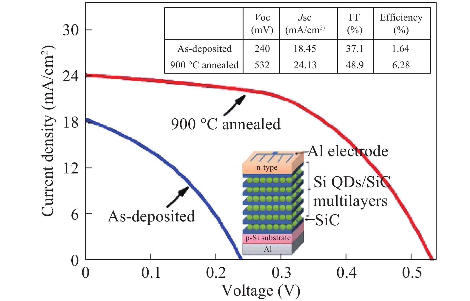 Cao Y, Xu J, Ge Z, et al. Enhanced broadband spectral response and energy conversion efficiency for hetero-junction solar cells with graded-sized Si quantum dots/SiC multilayers. J Mater Chem C, 2015, 3(46): 12061 doi: 10.1039/C5TC02585K