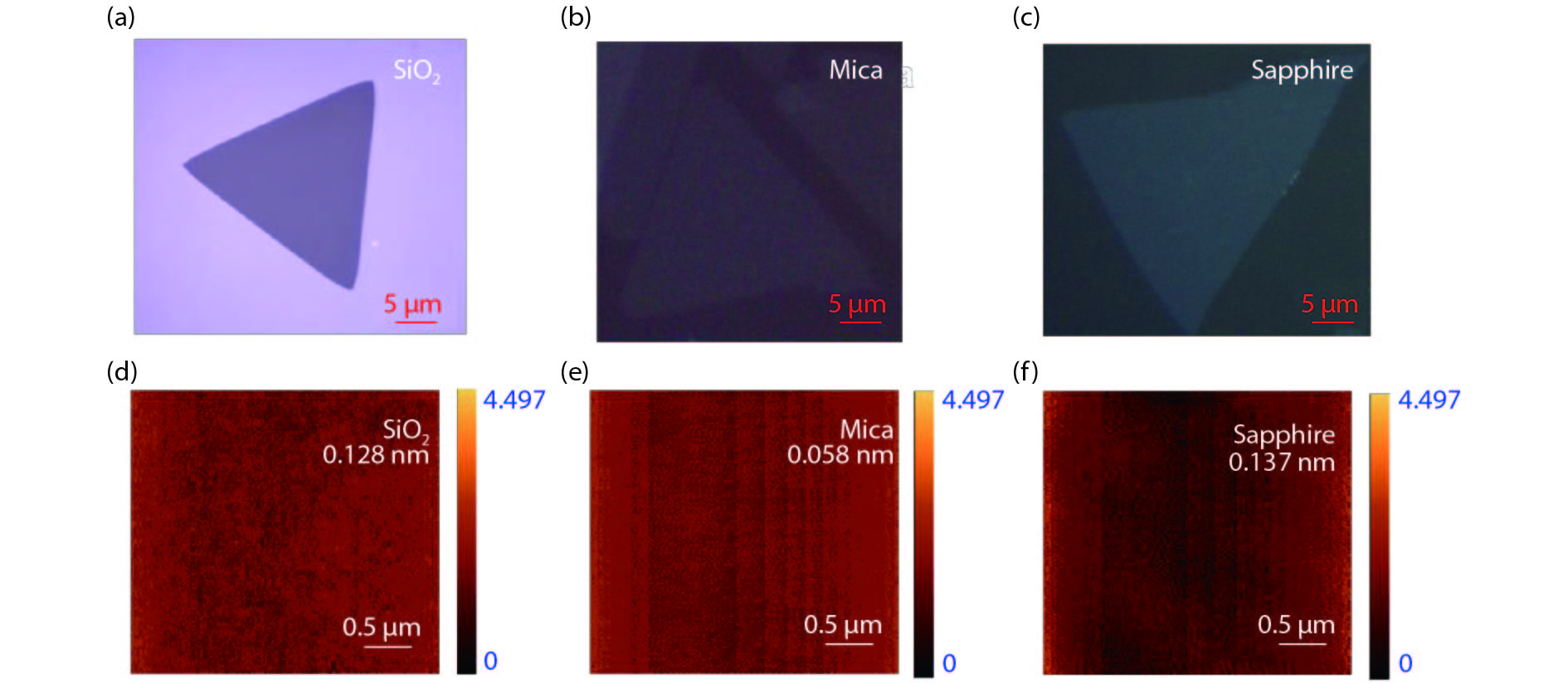 Abstract: Two-dimensional (2D) transition metal dichalcogenides alloys are potential materials in the application of photodetectors over a wide spectral range due to their composition-dependent bandgaps. The study of bandgap engineering is important for the application of 2D materials in devices. Here, we grow the Mo1?xWxSe2 alloys on mica, sapphire and SiO2/Si substrates by chemical vapor deposition (CVD) method. Mo1?xWxSe2 alloys are grown on the mica substrates by CVD method for the first time. Photoluminescence (PL) spectroscopy is used to investigate the effects of substrates and interlayer coupling force on the optical bandgaps of as-grown Mo1?xWxSe2 alloys. We find that the substrates used in this work have an ignorable effect on the optical bandgaps of as-grown Mo1?xWxSe2. The interlayer coupling effect on the optical bandgaps of as-grown Mo1?xWxSe2 is larger than the substrates effect. These findings provide a new way for the future study of the growth and physical properties of 2D alloy materials.