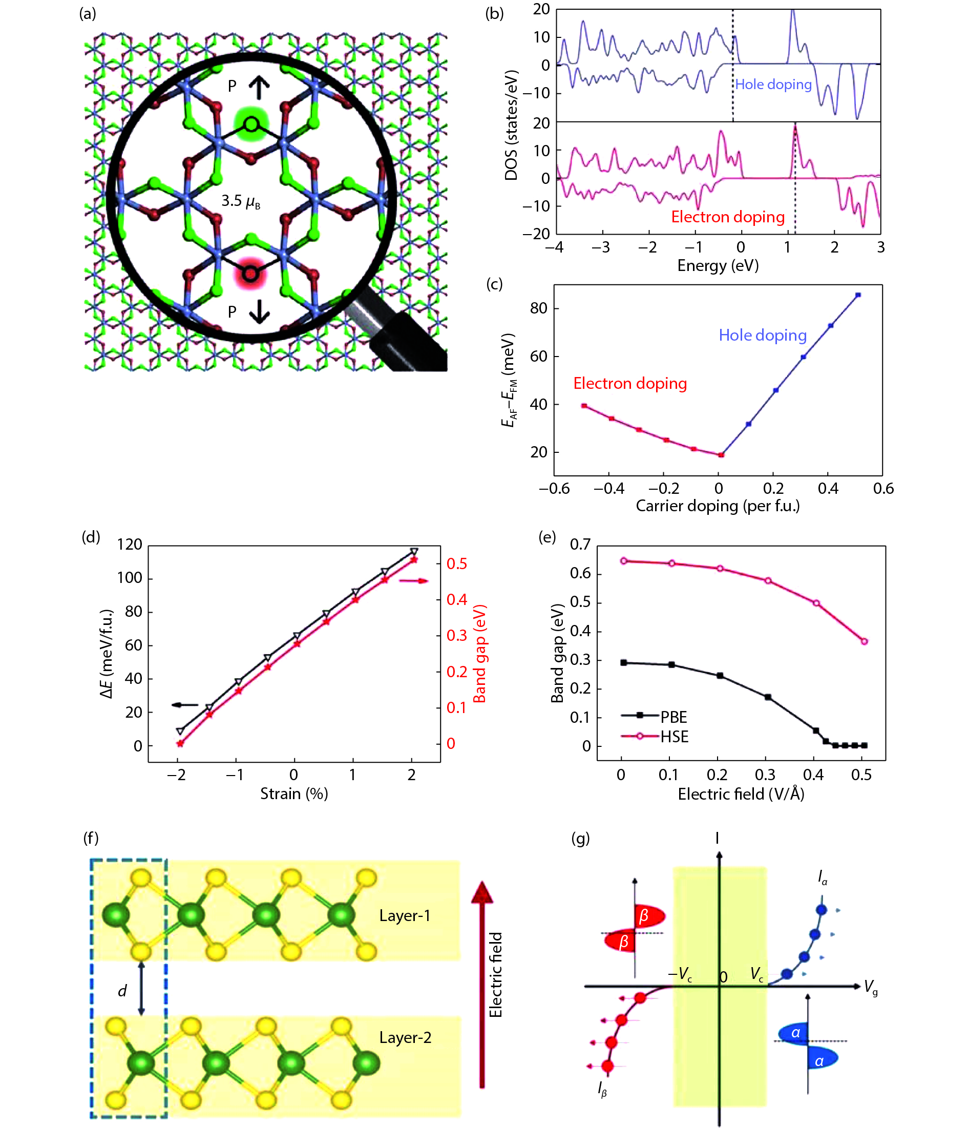 Fig. 2.  (Color online) (a) The I-vacancies models of monolayer CrI3. Reprinted with permission from Ref. [35]. Copyright 2018, American Chemical Society. (b) The DOS of CrI3 monolayer doped with 0.5 hole or 0.5 electron, and (c) Relationship between ferromagnetic stability and carrier doping concentration. The dashed vertical lines in (b) refer to the shifting Fermi level[36]. (d) The strain engineering of monolayer Cr2Ge2Te6 shows that the bandgaps vary with the increase of biaxial strain for the FM state (the red line), and the black line represents the variety of total energy difference between the AFM and FM configurations with the strain in the monolayer Cr2Ge2Te6. (e) The dependence of PBE and HSE06 bandgaps under a perpendicular electric field with different field strengths. Reprinted with permission from Ref. [17]. Copyright 2019, AIP Publishing. (f) The side view of the bilayer 2H-VSe2, with the electric field applied perpendicularly from layer 2 to layer 1. (g) The schematic spin-polarized current versus the gate voltage, with Vc indicating the critical voltage. The switching of the spin-ɑ current Iɑ and spin-β current Iβ can be manipulated by the gate voltage. Reprinted with permission from Ref. [37]. Copyright 2017, National Academy of Sciences.