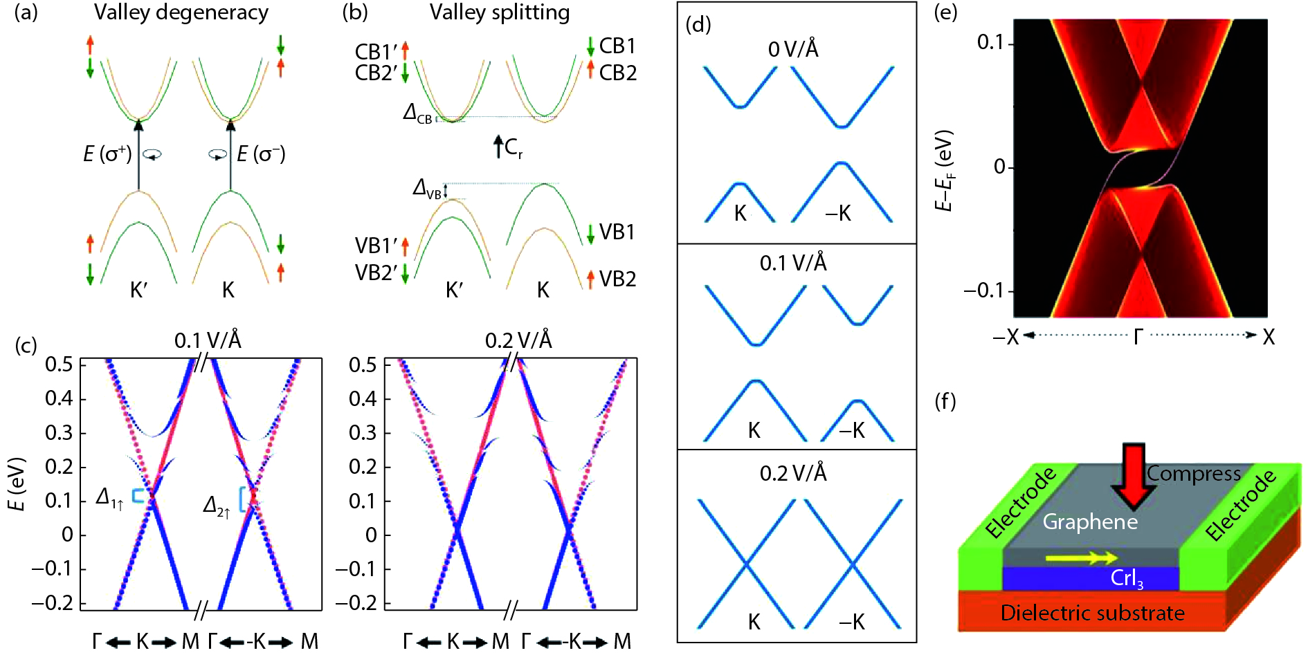 Fig. 6.  (Color online) (a) The energy diagram of the monolayer WSe2 at the K, K’ valleys. E(σ+) and E(σ–) represent the interband optical transition energies of right-hand (σ+) and left-hand (σ–) circularly polarized photons, respectively. The spin-up and spin-down valley-spin states are denoted with orange up- and green down-arrows, respectively. (b) Energy diagram depicting the K and K’ valley degeneracy lifting. The VB and CB stand for the valence and conduction band valley splittings, respectively. The black-up arrow denotes the Cr spin is aligned vertically upward, i.e., the magnetization axis of the CrI3. Reprinted with permission from Ref. [49]. Copyright 2019, American Physical Society. (c) projection bands of graphene around ±K with SOC under the electric field. (d) schematics illustration of change of valley splitting at ±K under the electric field. Reprinted with permission from Ref. [51]. Copyright 2019, Springer Nature. (e) The calculated edge density of states of the semi-infinite armchair-edged graphene system. (f) A schematic diagram depicting the observation of the QAH effect in graphene/CrI3 heterobilayer. The vertical red arrow denotes the external compression. The small horizontal yellow arrows indicate the two dissipationless edge current channels owned in the heterostructure. Reprinted with permission from Ref. [51]. Copyright 2018, American Physical Society.
