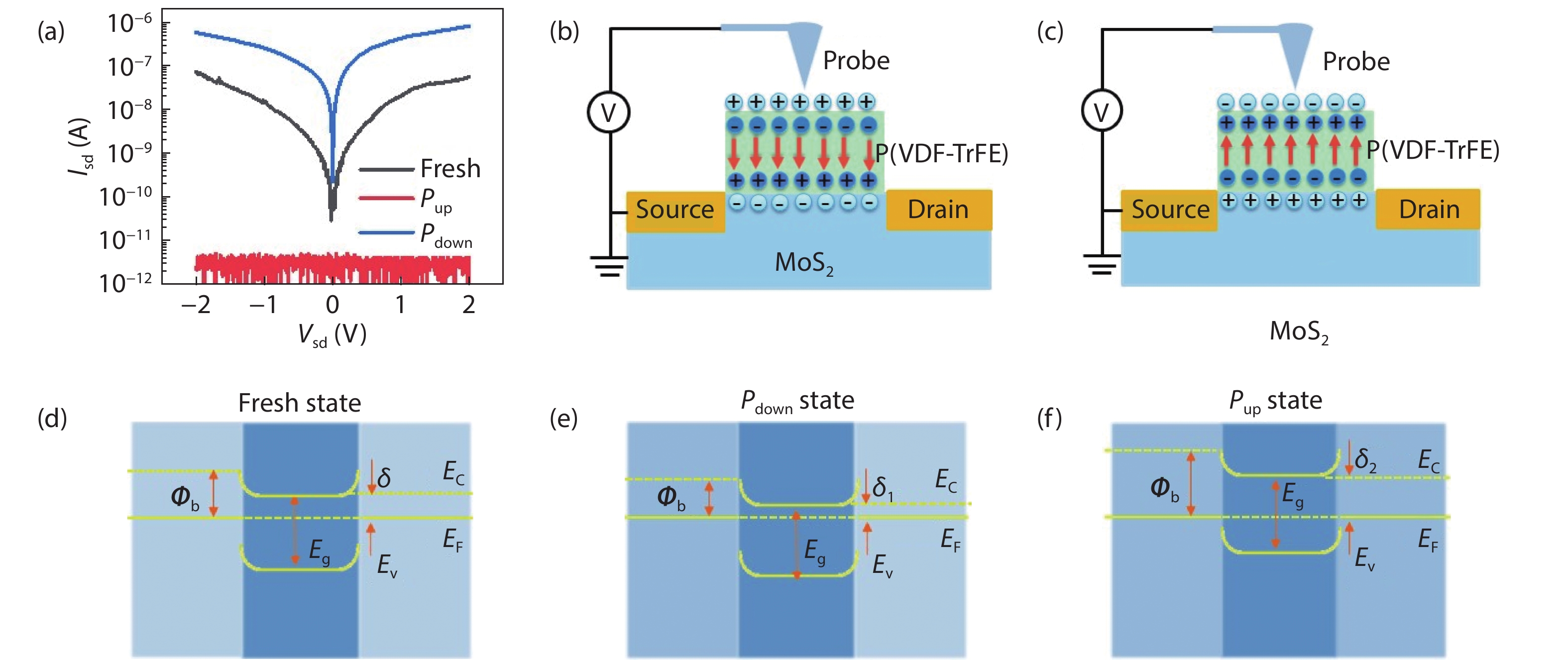 Abstract: During the past decades, transition metal dichalcogenides (TMDs) have received special focus for their unique properties in photoelectric detection. As one important member of TMDs, MoS2 has been made into photodetector purely or combined with other materials, such as graphene, ionic liquid, and ferroelectric materials. Here, we report a gate-free MoS2 phototransistor combined with organic ferroelectric material poly(vinylidene fluoride-trifluoroethylene) (P(VDF-TrFE)). In this device, the remnant polarization field in P(VDF-TrFE) is obtained from the piezoelectric force microscope (PFM) probe with a positive or negative bias, which can turn the dipoles from disorder to be the same direction. Then, the MoS2 channel can be maintained at an accumulated state with downward polarization field modulation and a depleted state with upward polarization field modulation. Moreover, the P(VDF-TrFE) segregates MoS2 from oxygen and water molecules around surroundings, which enables a cleaner surface state. As a photodetector, an ultra-low dark current of 10–11 A, on/off ration of more than 104 and a fast photoresponse time of 120 μs are achieved. This work provides a new method to make high-performance phototransistors assisted by the ferroelectric domain which can operate without a gate electrode and demonstrates great potential for ultra-low power consumption applications.