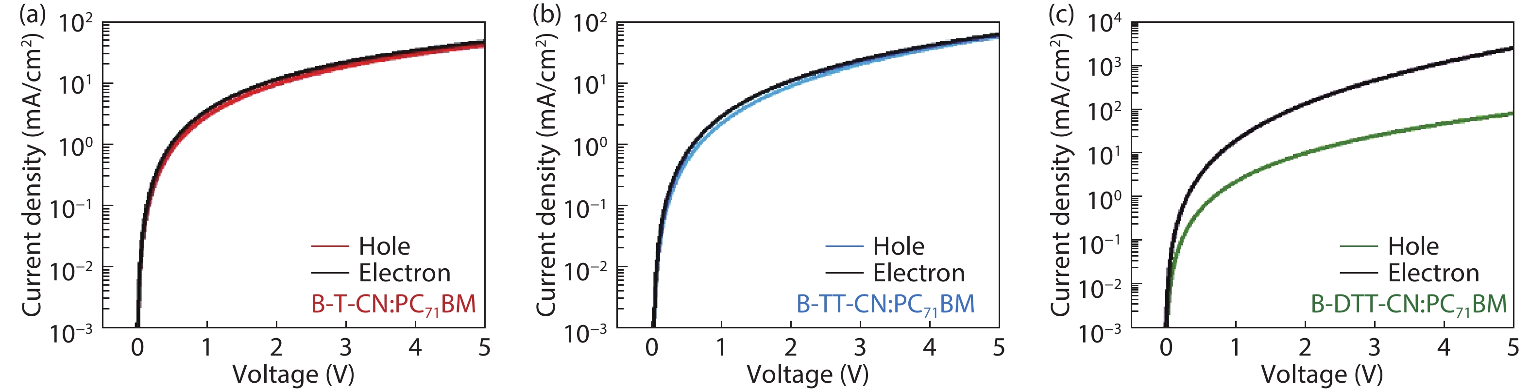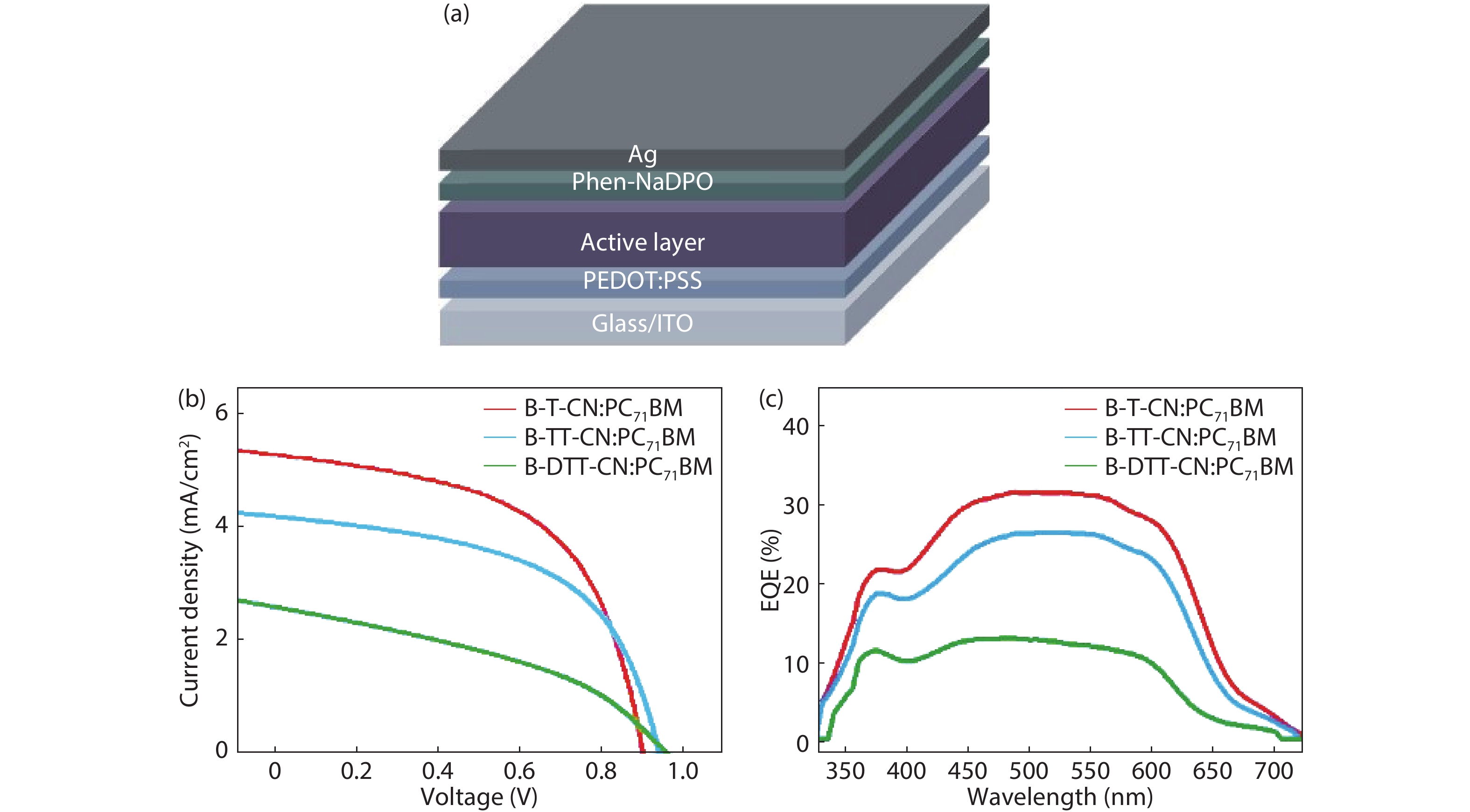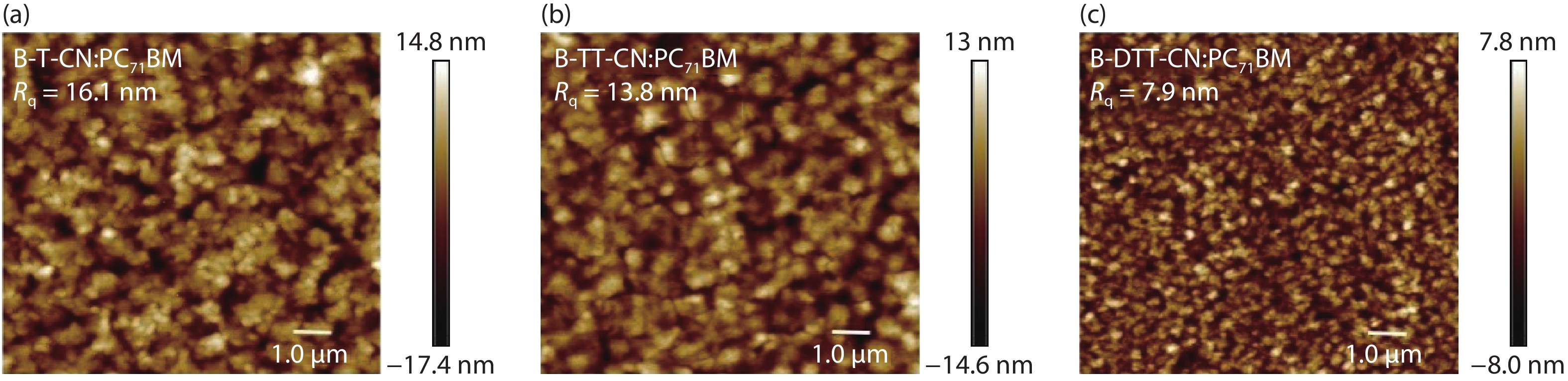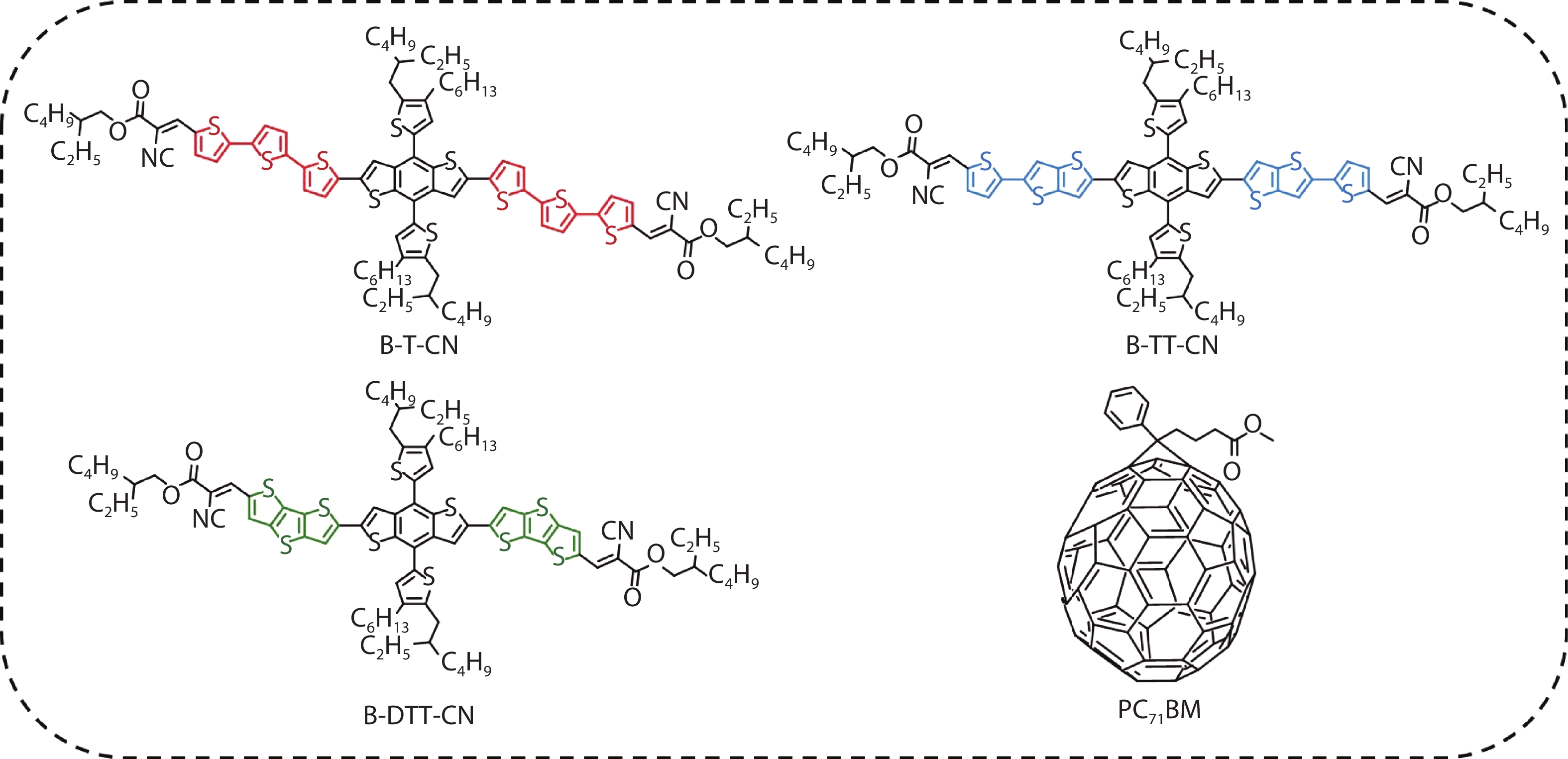 Table 2. Photovoltaic performances of B-T-CN:PC71BM-, B-TT-CN:PC71BM-, and B-DTT-CN:PC71BM-based OSC devices.