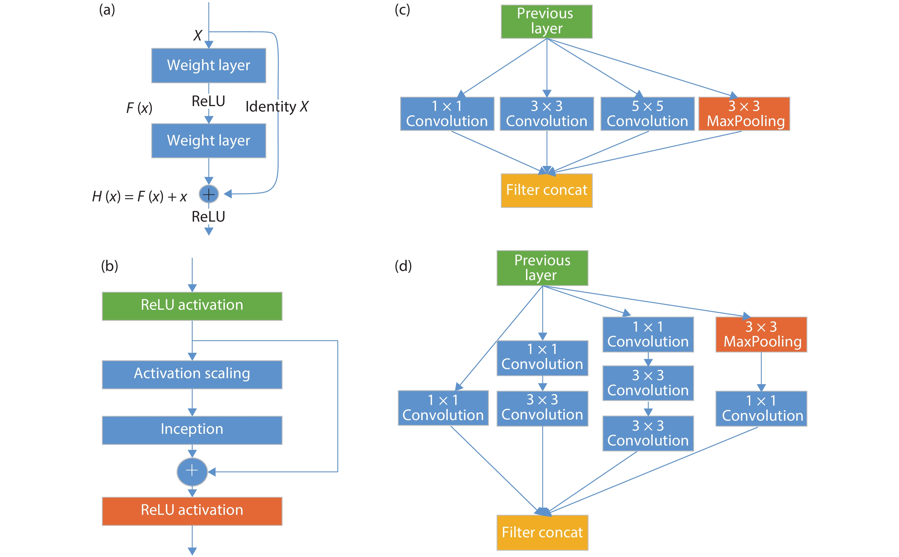 Fig. 1.  (Color online) Classical CNN model architectures. There are four fixed combination of layers in the figure. Among them, (a) stands for residual net in ResNet series networks, (b) expresses Inception-ResNet combination structure, (c) represents na?ve inception structure, and (d) shows an upgraded version of inception with dimension reduction feature.