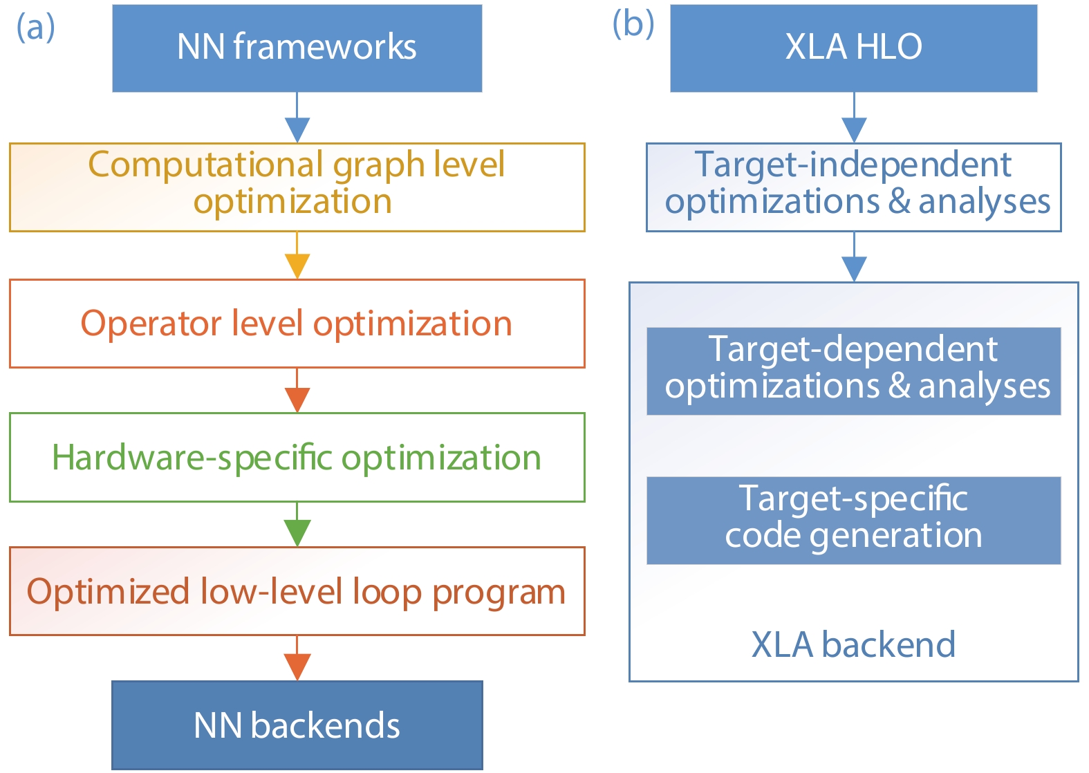 Fig. 3.  (Color online) (a) TVM and (b) XLA compiling optimization stack overview diagram.