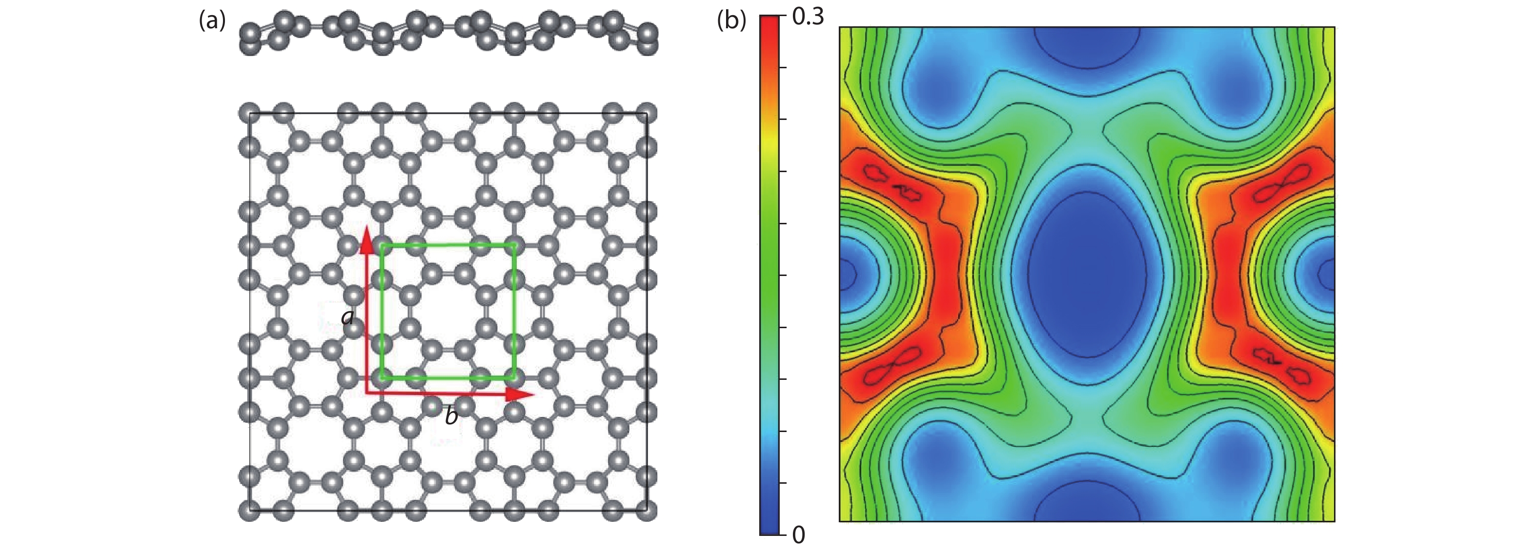 Fig. 1.  (Color online) (a) The crystalline structures and (b) 2D charge density difference plot of C568. The square unit-cell marked in green line, where a and b represent unitcell vectors.