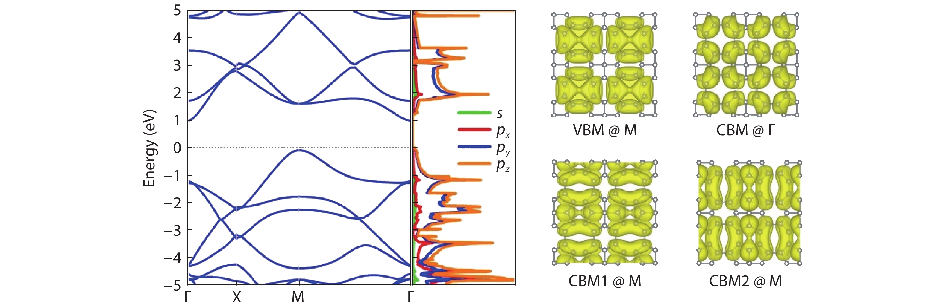 Fig. 2.  (Color online) The band structures and projected density of states of C568, with the Fermi level are set to zero. The charge densities of several key states are also presented.