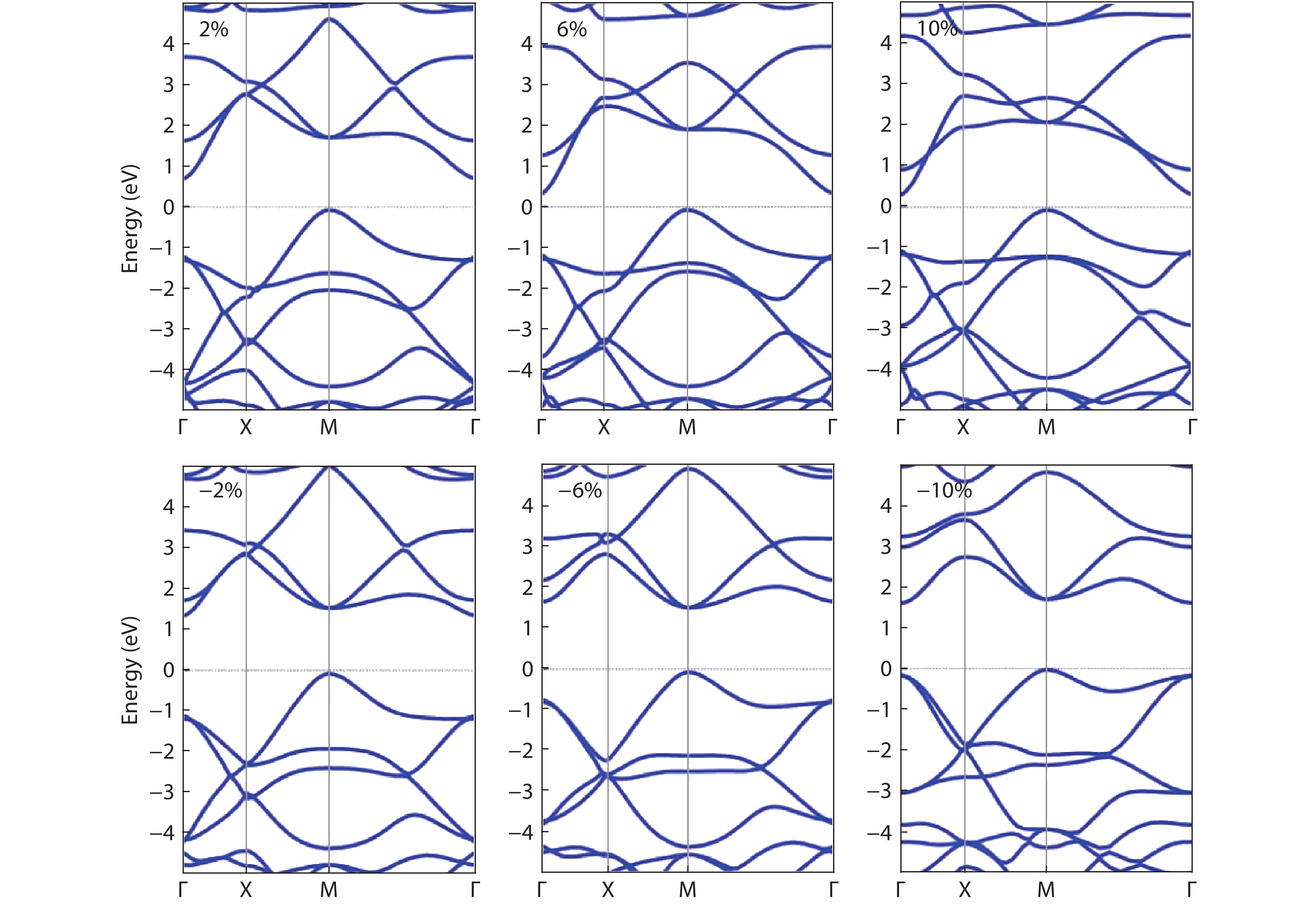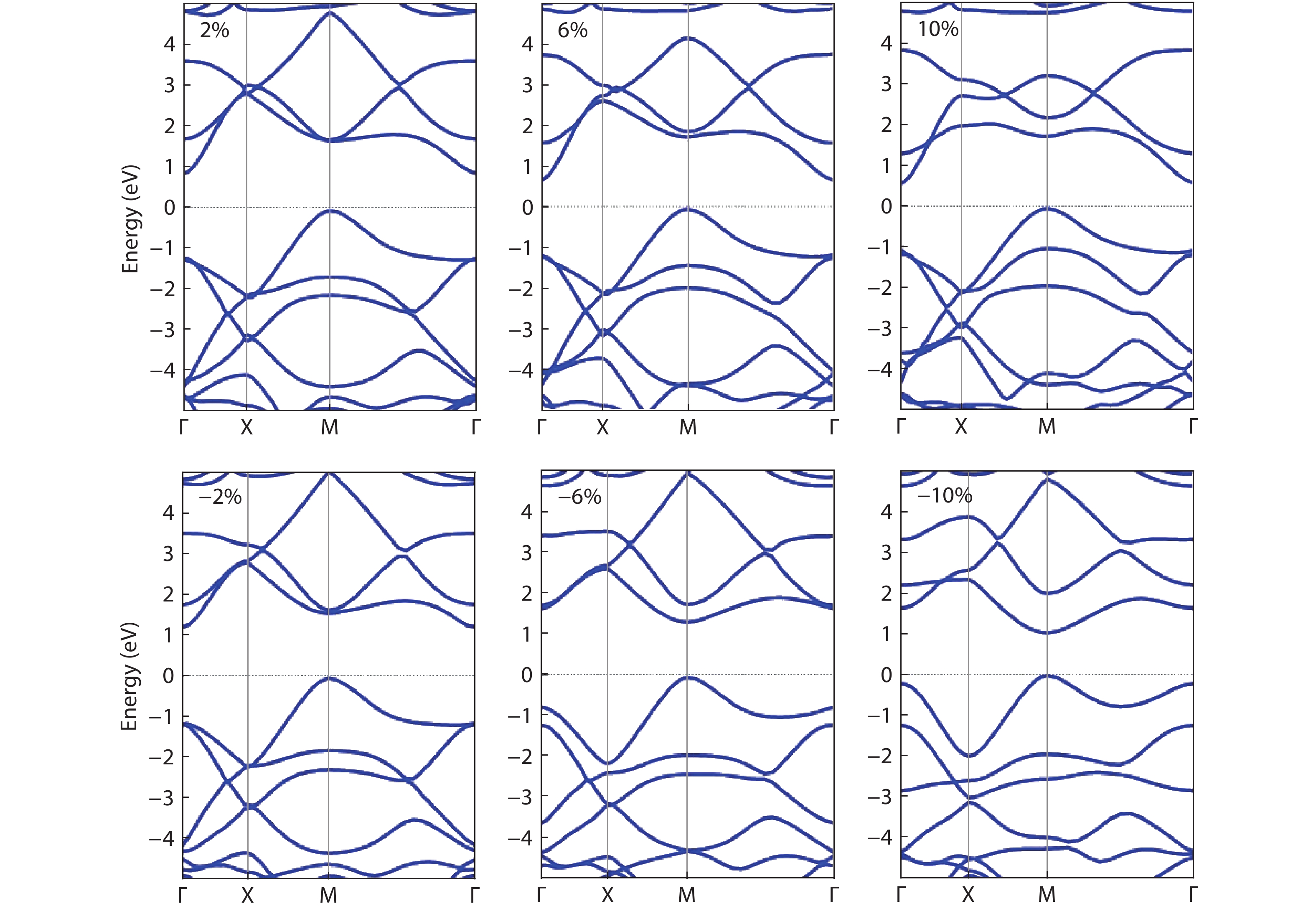 Fig. 5.  (Color online) Band structures of C568 with different biaxial strains, with the Fermi level set at zero and marked with blacked dashed line. Positive and negative values of strains indicate tensile and compressive cases, respectively.
