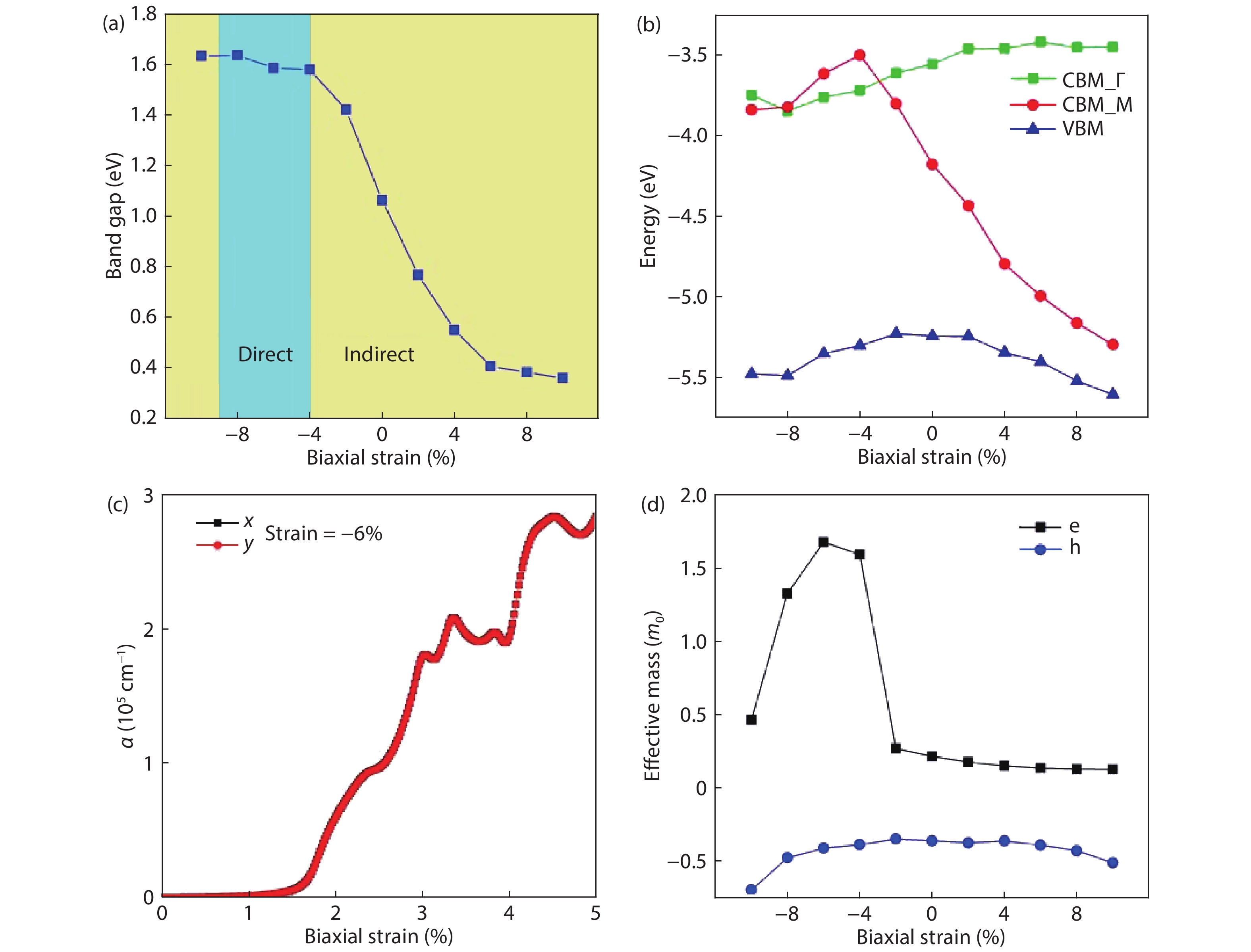 Fig. 6.  (Color online) (a) Band gap, (b) band alignment, (c) optical absorption, and (d) effective mass of C568 with different biaxial strains. CBM_Γ and CBM_M are the conduction band minimum at Γ and M points. The vacuum level is taken as the zero-energy reference in (b).