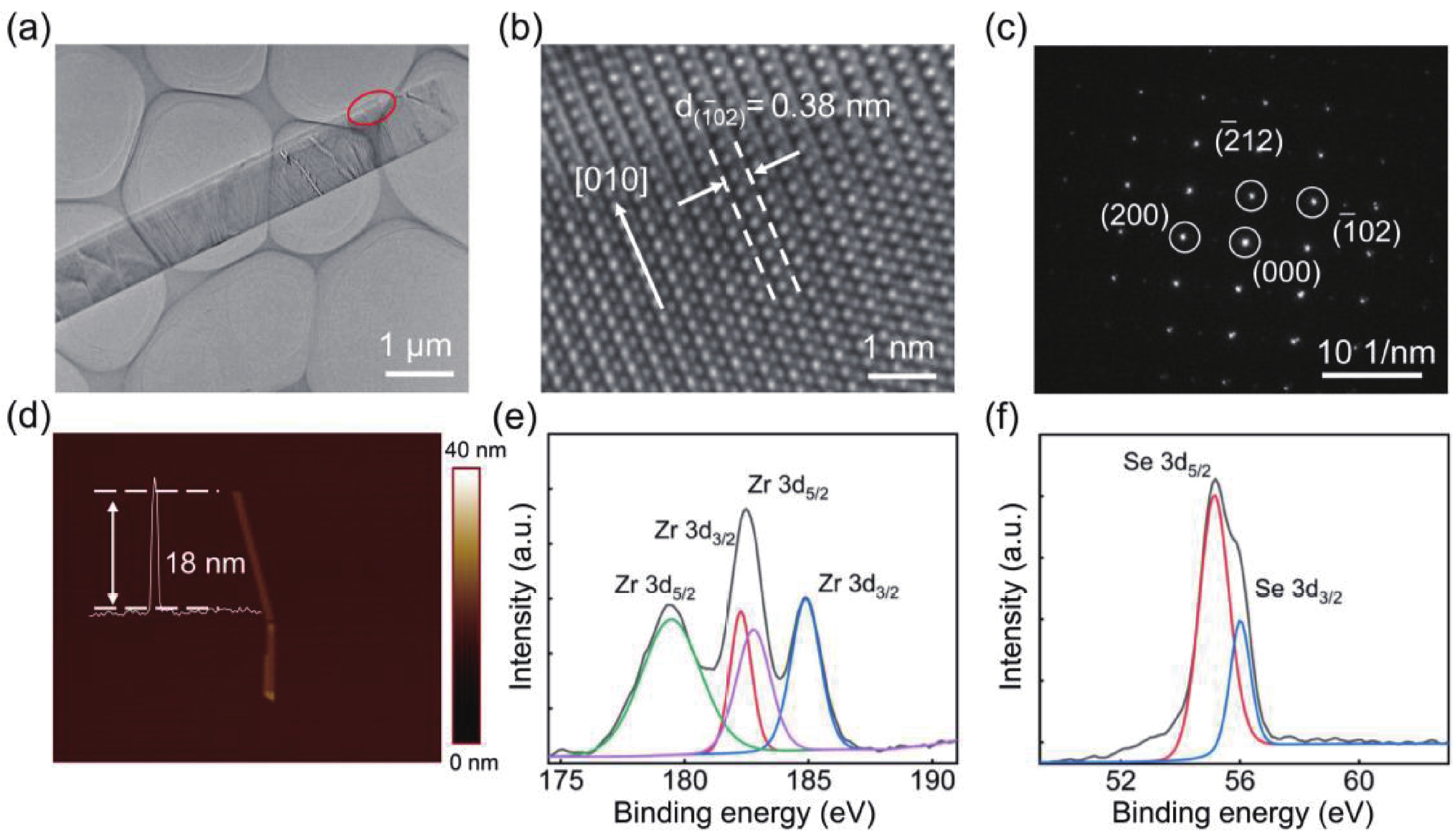 Abstract: The in-plane anisotropy of transition metal trichalcogenides (MX3) has a significant impact on the molding of materials and MX3 is a perfect choice for polarized photodetectors. In this study, the crystal structure, optical and optoelectronic anisotropy of one kind of quasi-one-dimensional (1D) semiconductors, ZrSe3, are systematically investigated through experiments and theoretical studies. The ZrSe3-based photodetector shows impressive wide spectral response from ultraviolet (UV) to near infrared (NIR) and exhibits great optoelectrical properties with photoresponsivity of 11.9 mA·W-1 and detectivity of ~106 at 532 nm. Moreover, the dichroic ratio of ZrSe3-based polarized photodetector is around 1.1 at 808 nm. This study suggests that ZrSe3 has potential in optoelectronic applications and polarization detectors.