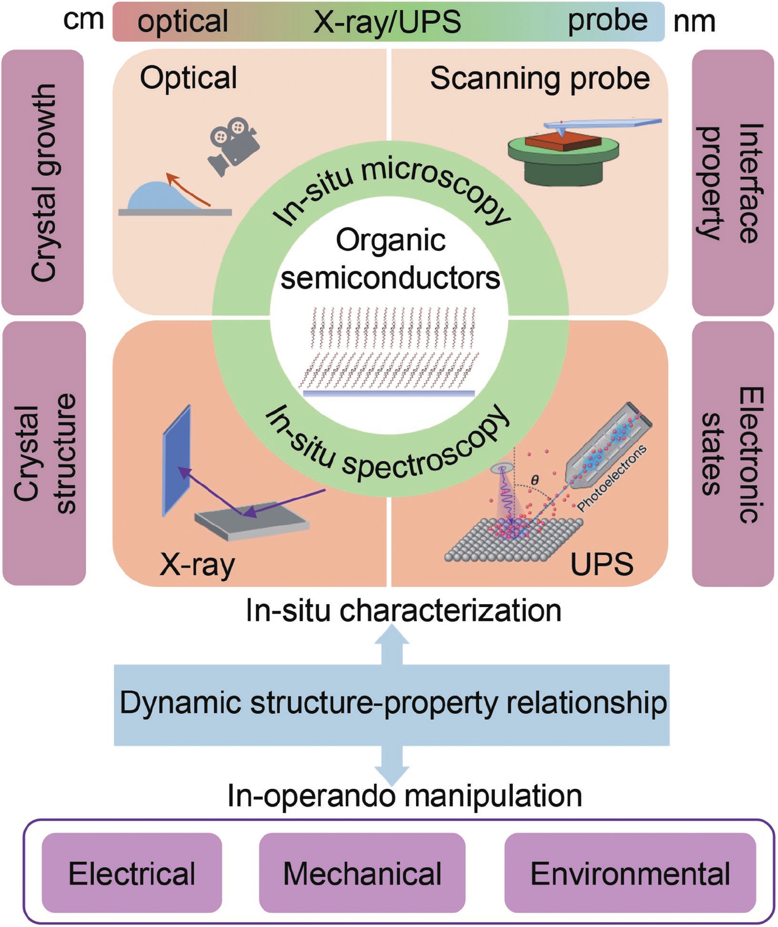 Abstract: The increasing demands of multifunctional organic electronics require advanced organic semiconducting materials to be developed and significant improvements to be made to device performance. Thus, it is necessary to gain an in-depth understanding of the film growth process, electronic states, and dynamic structure-property relationship under realistic operation conditions, which can be obtained by in-situ/operando characterization techniques for organic devices. Here, the up-to-date developments in the in-situ/operando optical, scanning probe microscopy, and spectroscopy techniques that are employed for studies of film morphological evolution, crystal structures, semiconductor-electrolyte interface properties, and charge carrier dynamics are described and summarized. These advanced technologies leverage the traditional static characterizations into an in-situ and interactive manipulation of organic semiconducting films and devices without sacrificing the resolution, which facilitates the exploration of the intrinsic structure-property relationship of organic materials and the optimization of organic devices for advanced applications.