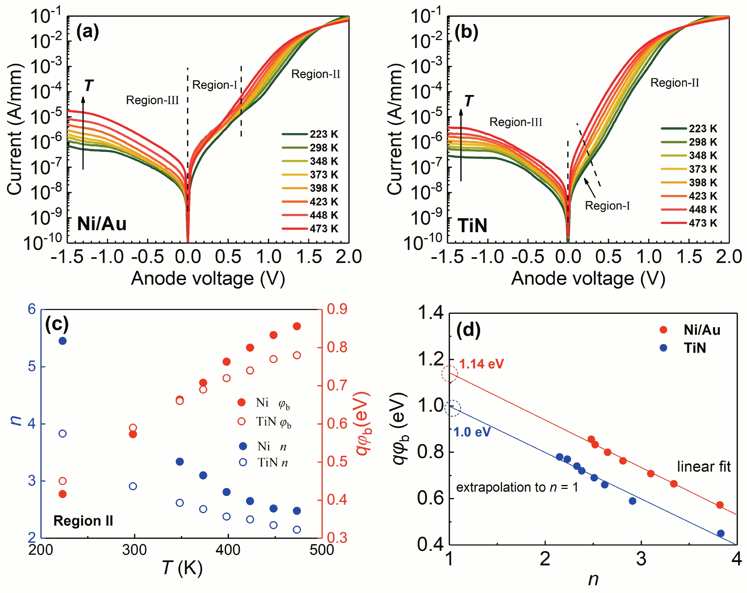 Schmitsdorf R F. Explanation of the linear correlation between barrier heights and ideality factors of real metal-semiconductor contacts by laterally nonuniform Schottky barriers. J Vac Sci Technol B, 1997, 15, 1221 doi: 10.1116/1.589442