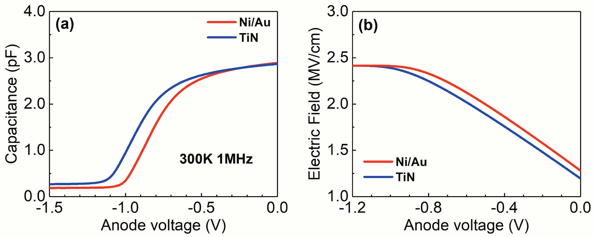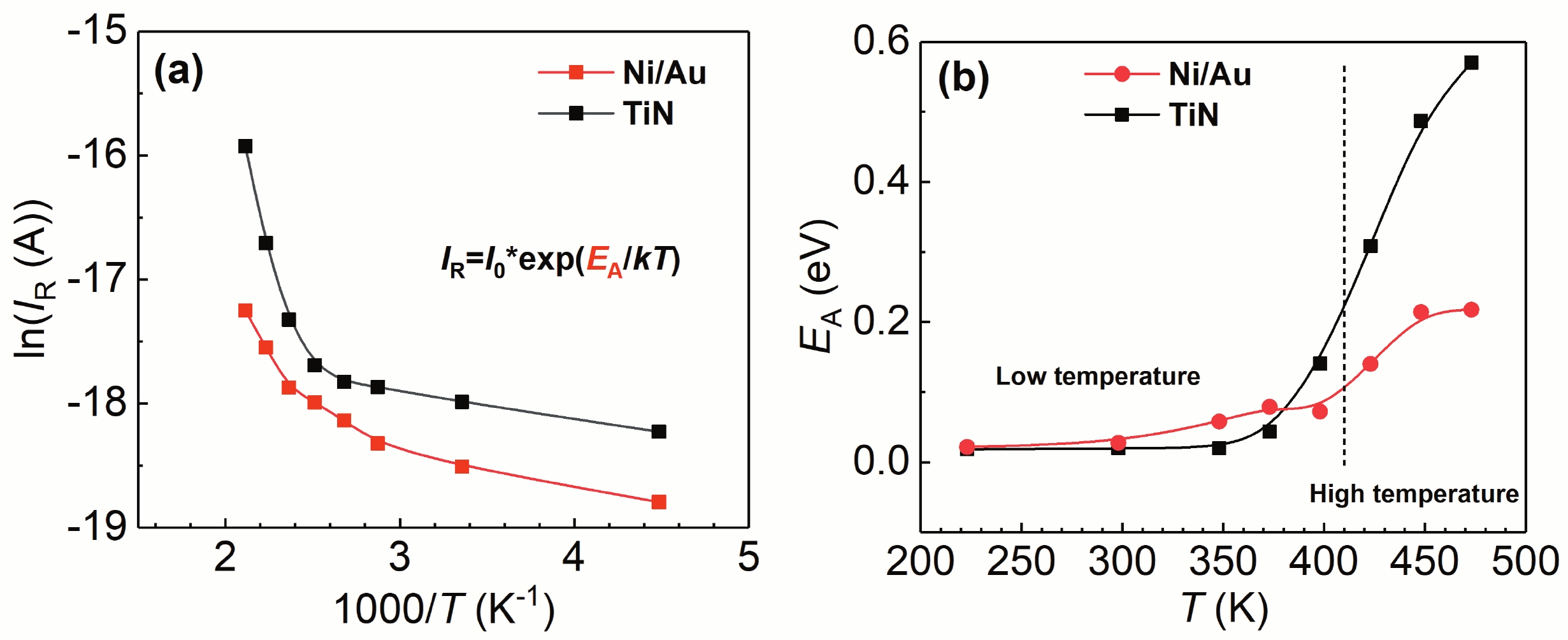 Abstract: In this work, the optimization of reverse leakage current (IR) and turn-on voltage (VT) in recess-free AlGaN/GaN Schottky barrier diodes (SBDs) was achieved by substituting the Ni/Au anode with TiN anode. To explain this phenomenon, the current transport mechanism was investigated by temperature-dependent current–voltage (I–V) characteristics. For forward bias, the current is dominated by the thermionic emission (TE) mechanisms for both devices. Besides, the presence of inhomogeneity of the Schottky barrier height (qφb) is proved by the linear relationship between qφb and ideality factor. For reverse bias, the current is dominated by two different mechanisms at high temperature and low temperature, respectively. At high temperatures, the Poole–Frenkel emission (PFE) induced by nitrogen-vacancy (VN) is responsible for the high IR in Ni/Au anode. For TiN anode, the IR is dominated by the PFE from threading dislocation (TD), which can be attributed to the decrease of VN due to the suppression of N diffusion at the interface of Schottky contact. At low temperatures, the IR of both diodes is dominated by Fowler–Nordheim (FN) tunneling. However, the VN donor enhances the electric field in the barrier layer, thus causing a higher IR in Ni/Au anode than TiN anode, as confirmed by the modified FN model.