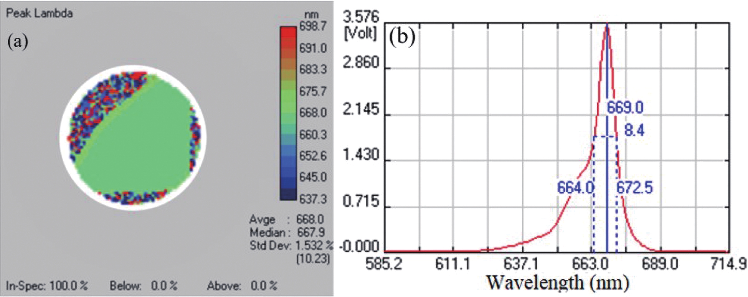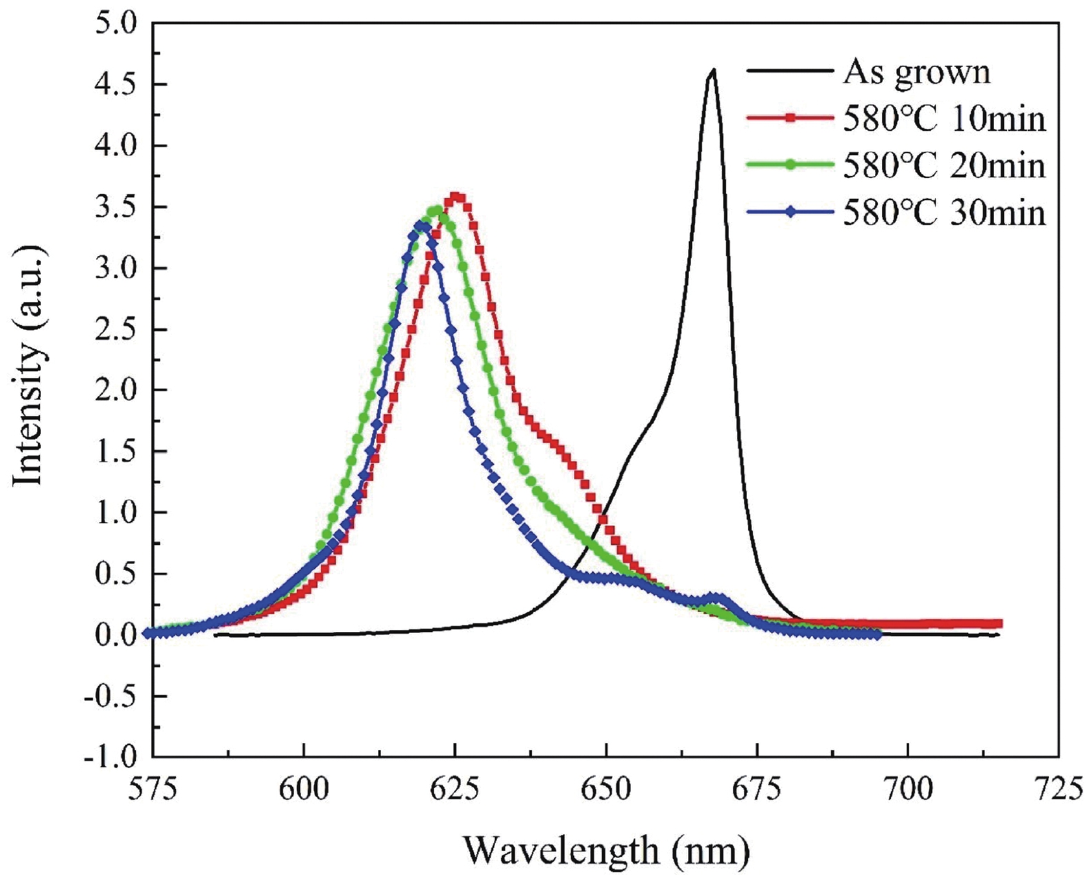Abstract: The optical catastrophic damage that usually occurs at the cavity surface of semiconductor lasers has become the main bottleneck affecting the improvement of laser output power and long-term reliability. To improve the output power of 680 nm AlGaInP/GaInP quantum well red semiconductor lasers, Si–Si3N4 composited dielectric layers are used to induce its quantum wells to be intermixed at the cavity surface to make a non-absorption window. Si with a thickness of 100 nm and Si3N4 with a thickness of 100 nm were grown on the surface of the epitaxial wafer by magnetron sputtering and PECVD as diffusion source and driving source, respectively. Compared with traditional Si impurity induced quantum well intermixing, this paper realizes the blue shift of 54.8 nm in the nonabsorbent window region at a lower annealing temperature of 600 °C and annealing time of 10 min. Under this annealing condition, the wavelength of the gain luminescence region basically does not shift to short wavelength, and the surface morphology of the whole epitaxial wafer remains fine after annealing. The application of this process condition can reduce the difficulty of production and save cost, which provides an effective method for upcoming fabrication.