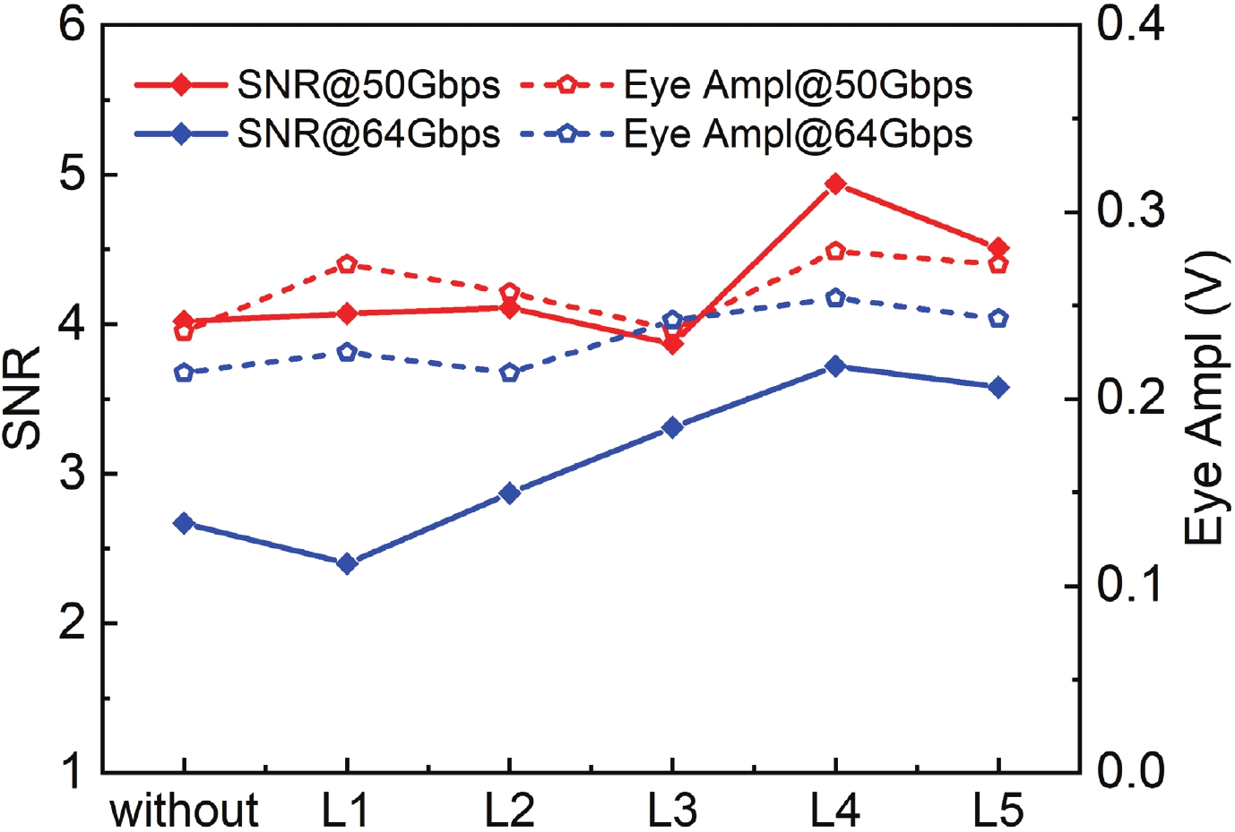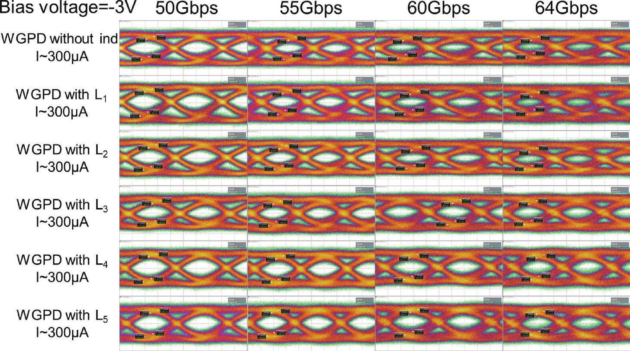 Abstract: High-performance germanium (Ge) waveguide photodetectors are designed and fabricated utilizing the inductive-gain-peaking technique. With the appropriate integrated inductors, the 3-dB bandwidth of photodetectors is significantly improved owing to the inductive-gain-peaking effect without any compromises to the dark current and optical responsivity. Measured 3-dB bandwidth up to 75 GHz is realized and clear open eye diagrams at 64 Gbps are observed. In this work, the relationship between the frequency response and large signal transmission characteristics on the integrated inductors of Ge waveguide photodetectors is investigated, which indicates the high-speed performance of photodetectors using the inductive-gain-peaking technique.