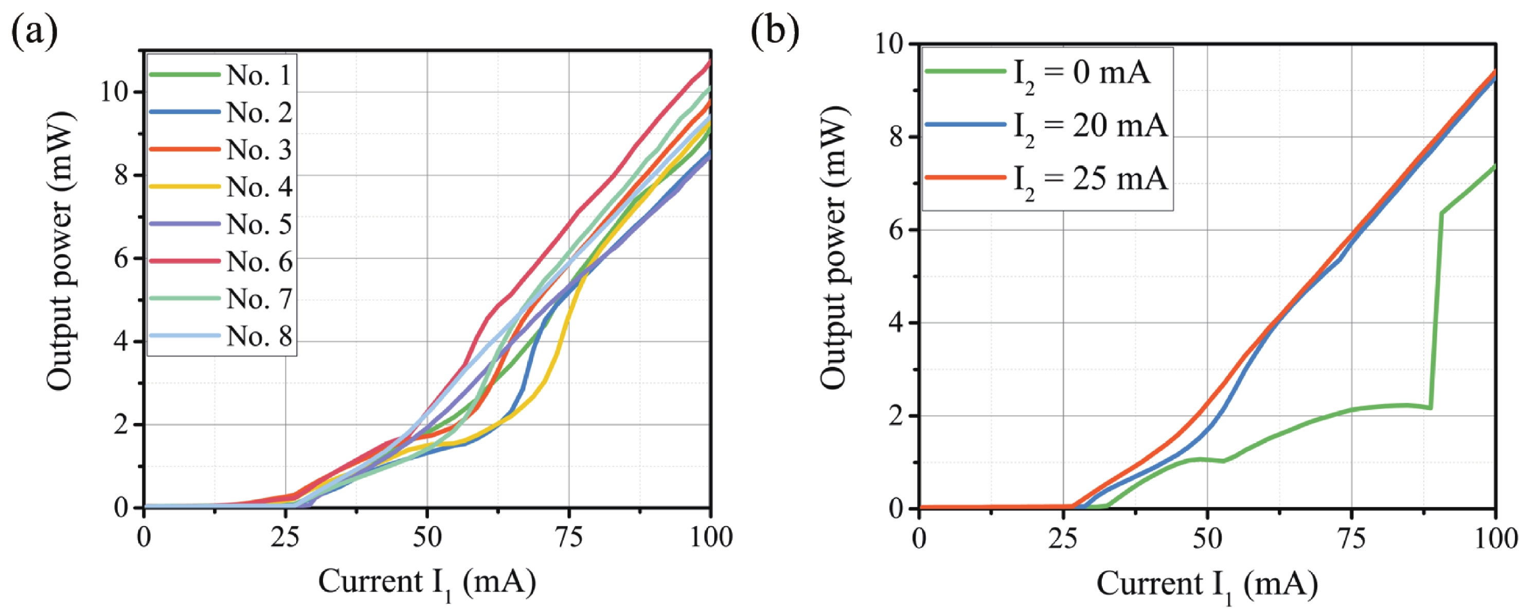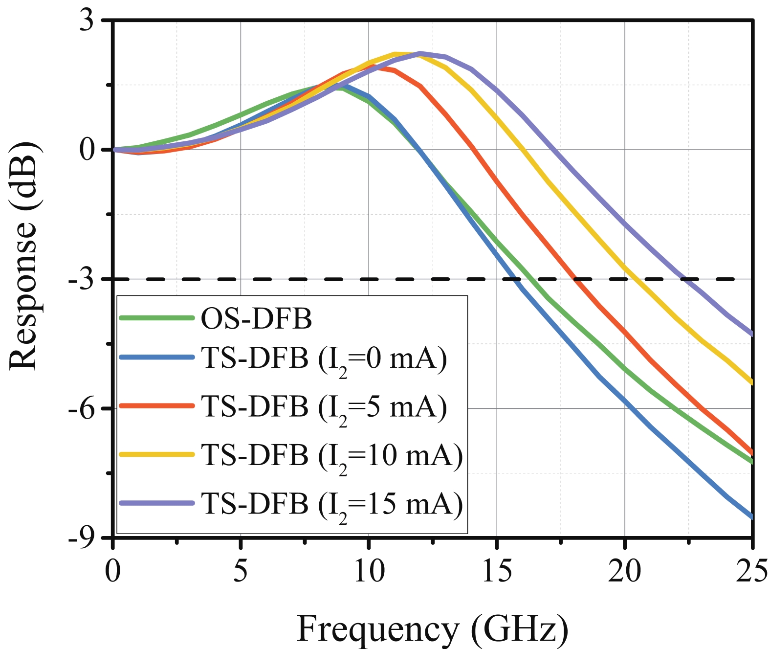 Abstract: Modulation bandwidth enhancement in a directly modulated two-section distributed feedback (TS-DFB) laser based on a detuned loading effect is investigated and experimentally demonstrated. The results show that the 3-dB bandwidth of the TS-DFB laser is increased to 17.6 GHz and that chirp parameter can be reduced to 2.24. Compared to the absence of a detuned loading effect, there is a 4.6 GHz increase and a 2.45 reduction, respectively. After transmitting a 10 Gb/s non-return-to-zero (NRZ) signal through a 5-km fiber, the modulation eye diagram still achieves a large opening. Eight-channel laser arrays with precise wavelength spacing are fabricated. Each TS-DFB laser in the array has side mode suppression ratios (SMSR) > 49.093 dB and the maximum wavelength residual < 0.316 nm.