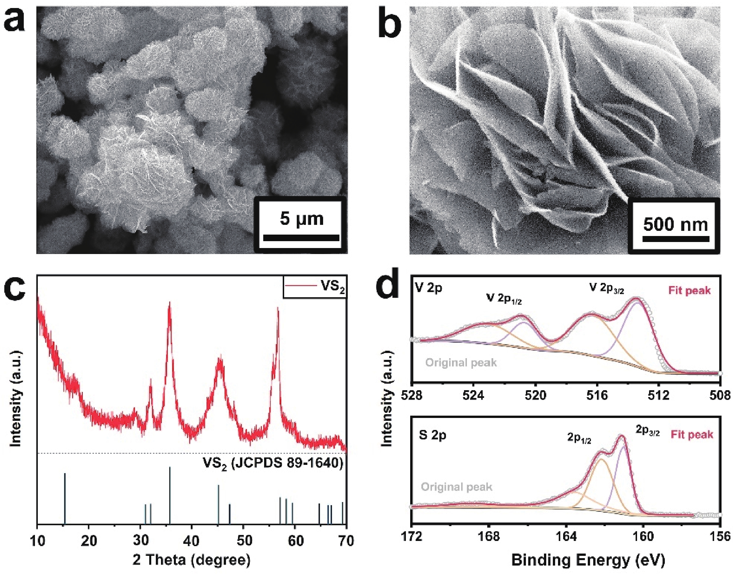 Fig. 1.  (Color online) Characterizations of few-layered VS2. (a, b) SEM images. (c) XRD pattern and the standard pattern. (d) XPS spectra.