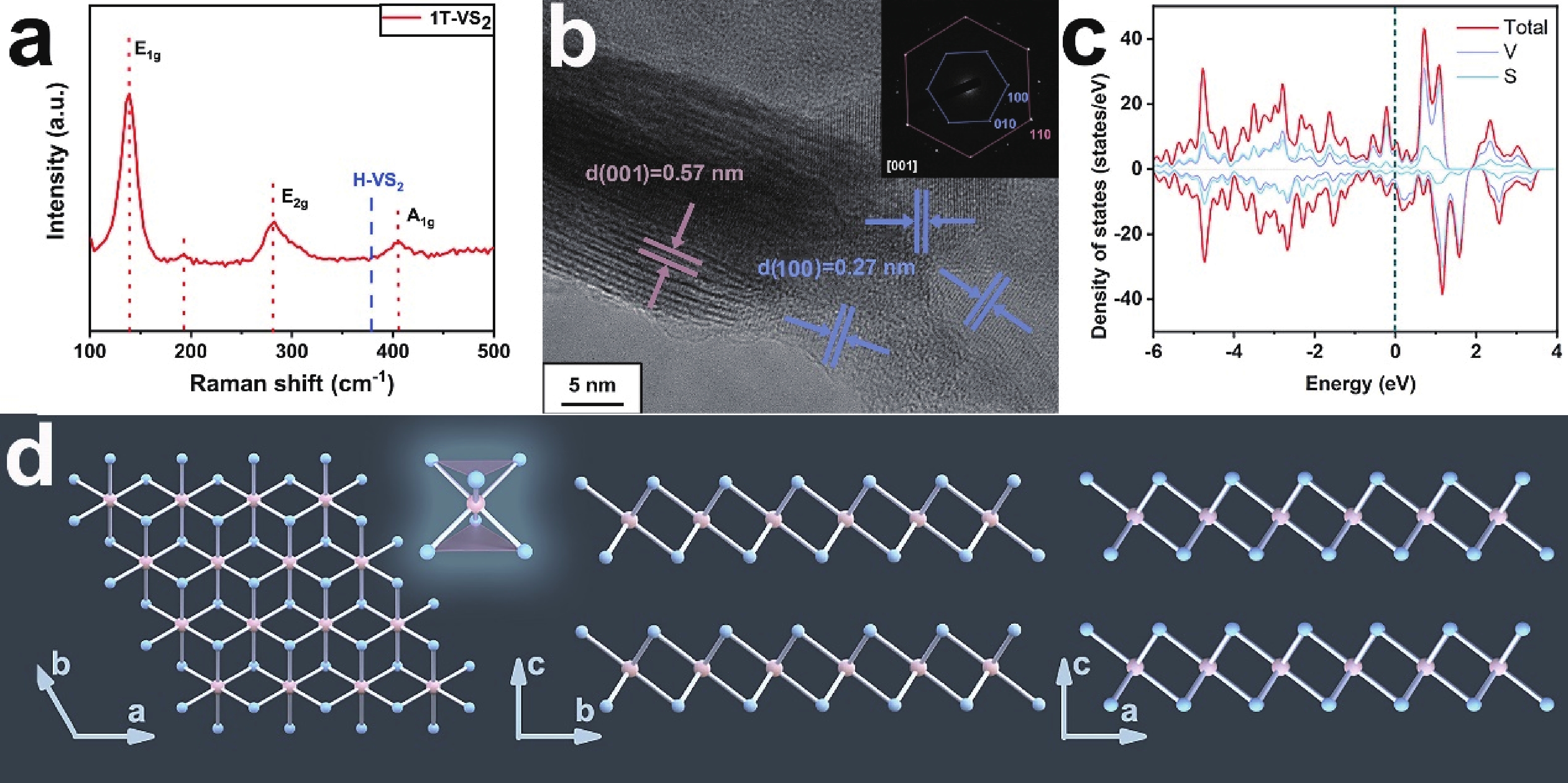 Fig. 2.  (Color online) (a) Raman spectrum, (b) HRTEM images with SAED, (c) DOS diagram, and (d) VS2 structure along different directions.