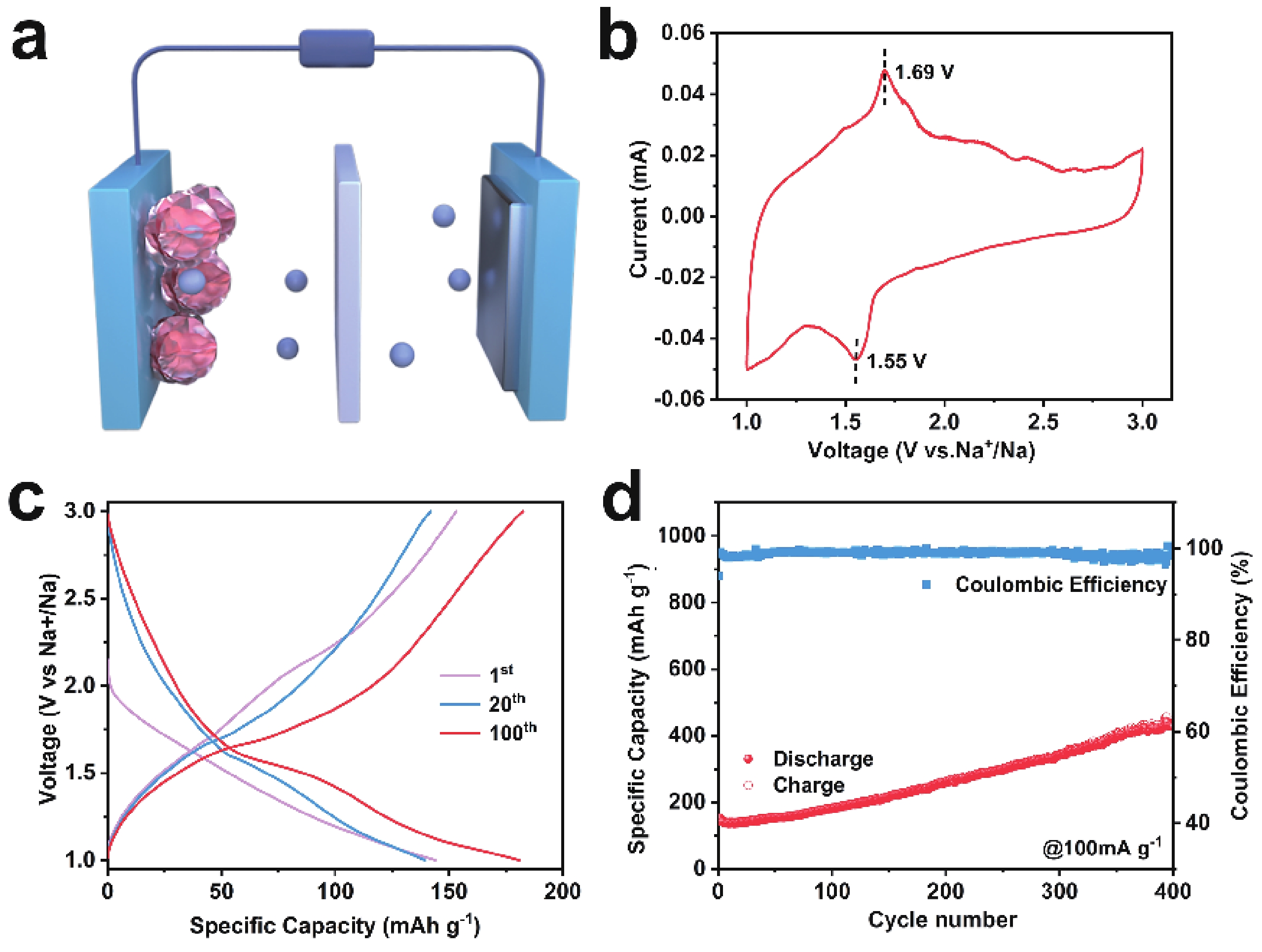 Fig. 3.  (Color online) (a) Detailed schemes of 1T-VS2-based sodium-ion battery. (b) CV curves for the 3rd cycle at 0.1 mV?s?1. (c) The galvanostatic discharge/charge profiles of 1st, 20th and 100th at 100 mA?g?1. (d) Cycling retentions at 100 mA?g?1.