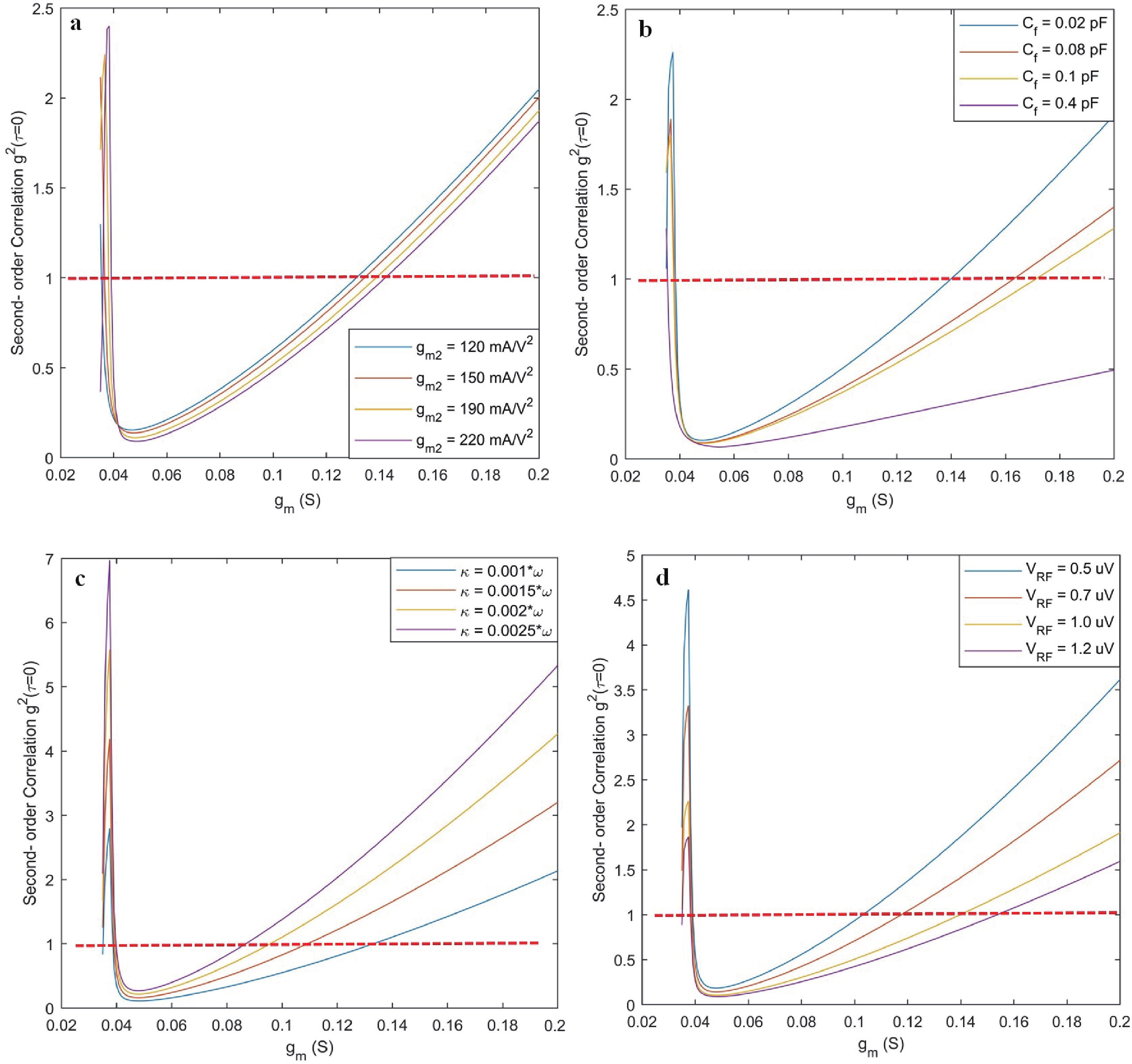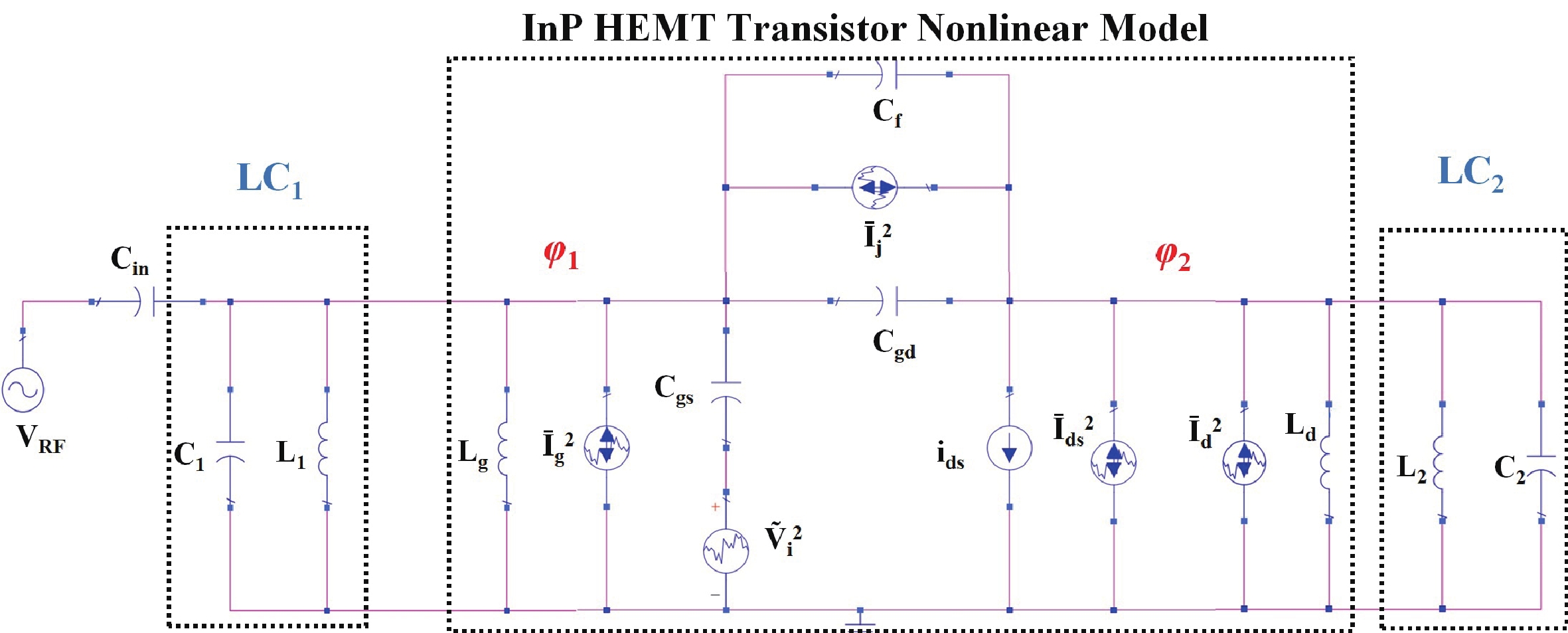 Abstract: This study focuses on generating and manipulating squeezed states with two external oscillators coupled by an InP HEMT operating at cryogenic temperatures. First, the small-signal nonlinear model of the transistor at high frequency at 5 K is analyzed using quantum theory, and the related Lagrangian is theoretically derived. Subsequently, the total quantum Hamiltonian of the system is derived using Legendre transformation. The Hamiltonian of the system includes linear and nonlinear terms by which the effects on the time evolution of the states are studied. The main result shows that the squeezed state can be generated owing to the transistor’s nonlinearity; more importantly, it can be manipulated by some specific terms introduced in the nonlinear Hamiltonian. In fact, the nonlinearity of the transistors induces some effects, such as capacitance, inductance, and second-order transconductance, by which the properties of the external oscillators are changed. These changes may lead to squeezing or manipulating the parameters related to squeezing in the oscillators. In addition, it is theoretically derived that the circuit can generate two-mode squeezing. Finally, second-order correlation (photon counting statistics) is studied, and the results demonstrate that the designed circuit exhibits antibunching, where the quadrature operator shows squeezing behavior.