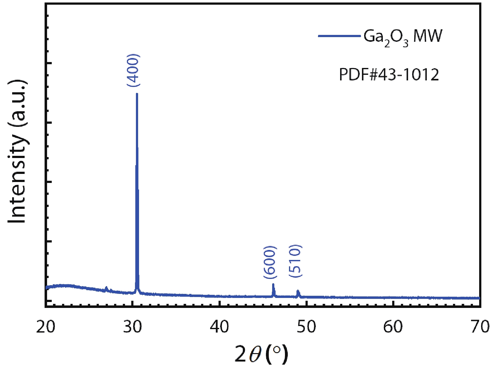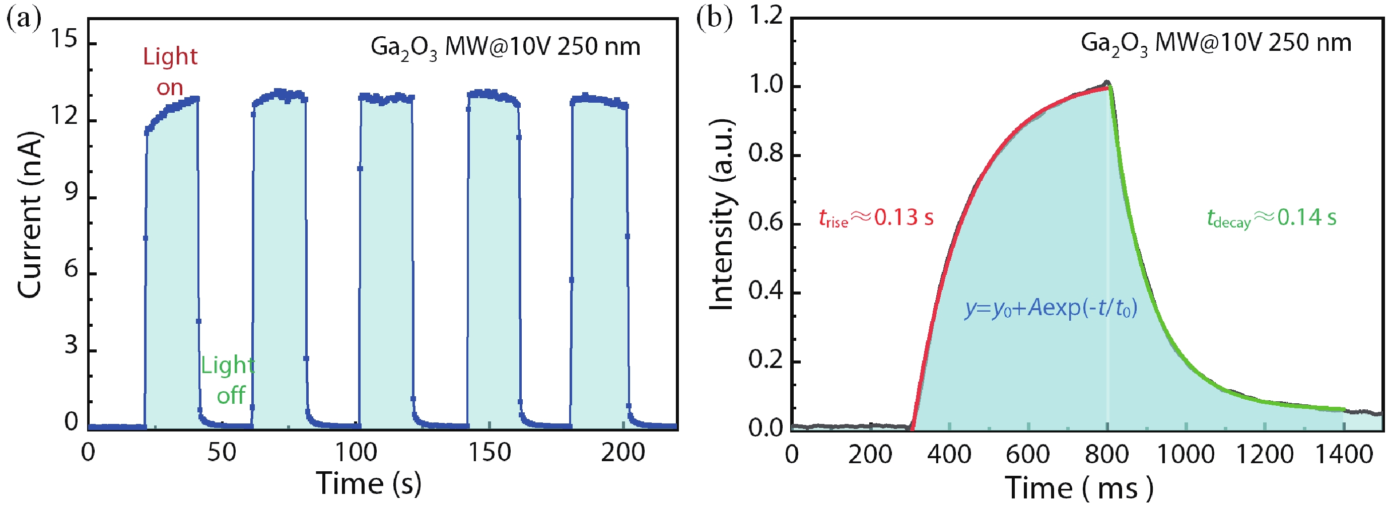 Abstract: Ultrawide band gap semiconductors are promising solar-blind ultraviolet (UV) photodetector materials due to their suitable bandgap, strong absorption and high sensitivity. Here, β-Ga2O3 microwires with high crystal quality and large size were grown by the chemical vapor deposition (CVD) method. The microwires reach up to 1 cm in length and were single crystalline with low defect density. Owing to its high crystal quality, a metal–semiconductor–metal photodetector fabricated from a Ga2O3 microwire showed a responsivity of 1.2 A/W at 240 nm with an ultrahigh UV/visible rejection ratio (Rpeak/R400 nm) of 5.8 × 105, indicating that the device has excellent spectral selectivity. In addition, no obvious persistent photoconductivity was observed in the test. The rise and decay time constants of the device were 0.13 and 0.14 s, respectively. This work not only provides a growth method for high-quality Ga2O3 microwires, but also demonstrates the excellent performance of Ga2O3 microwires in solar-blind ultraviolet detection.