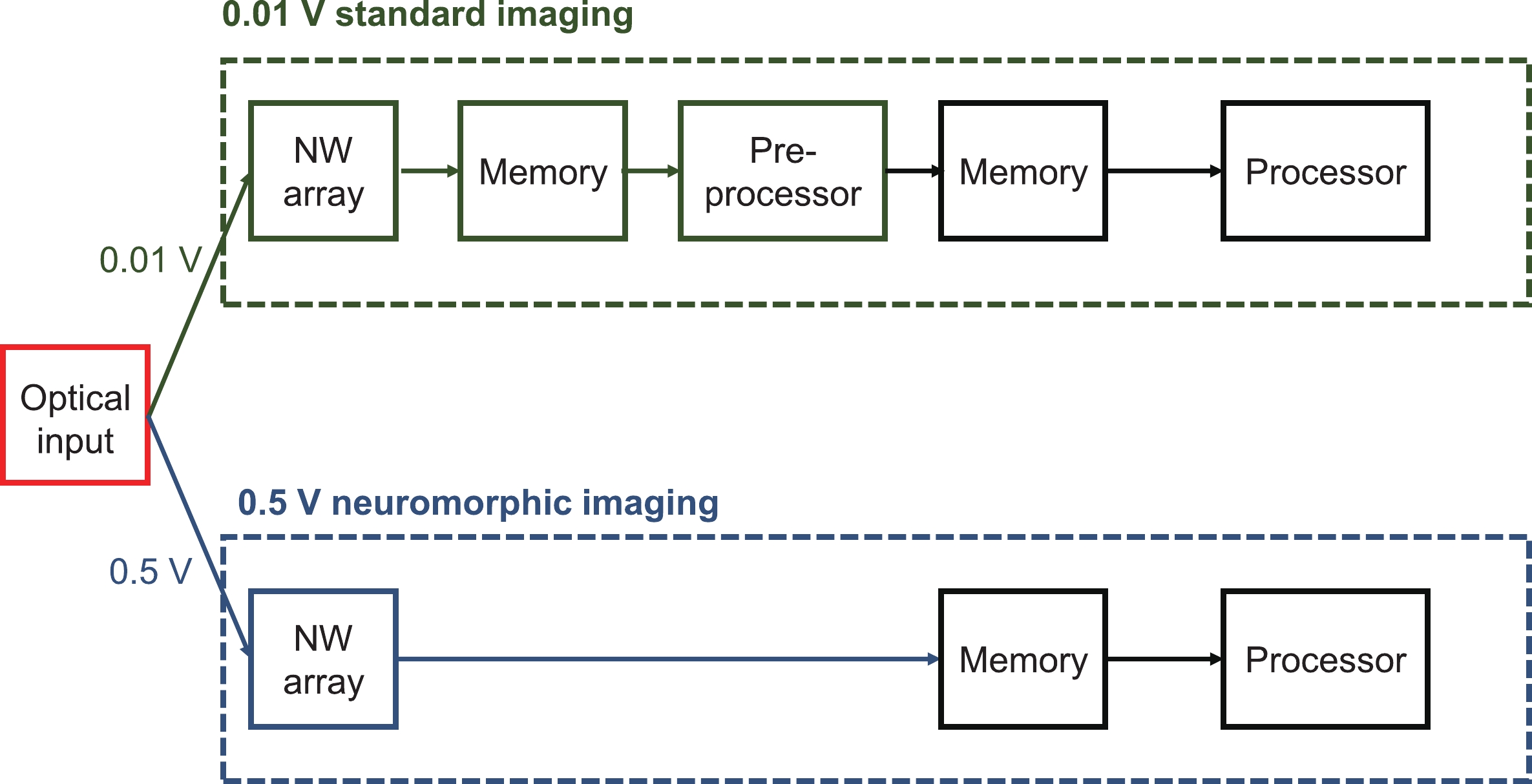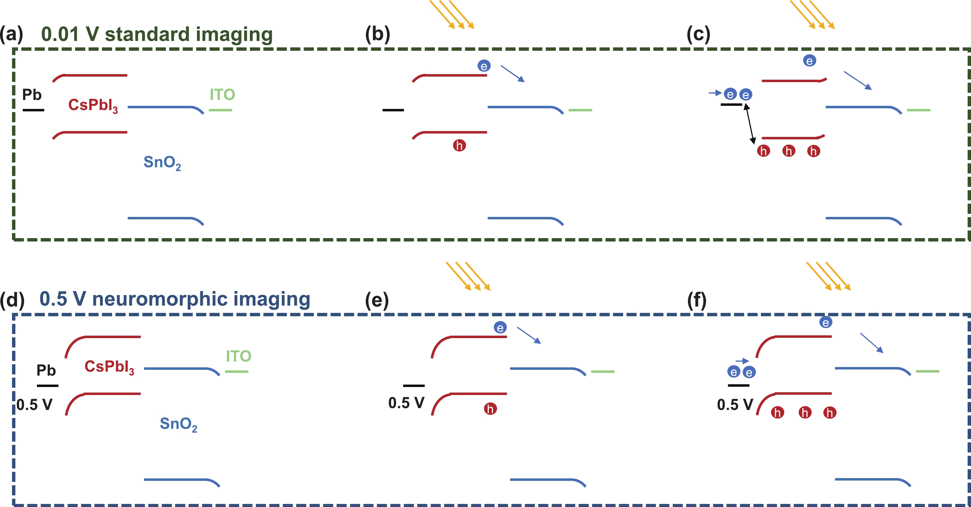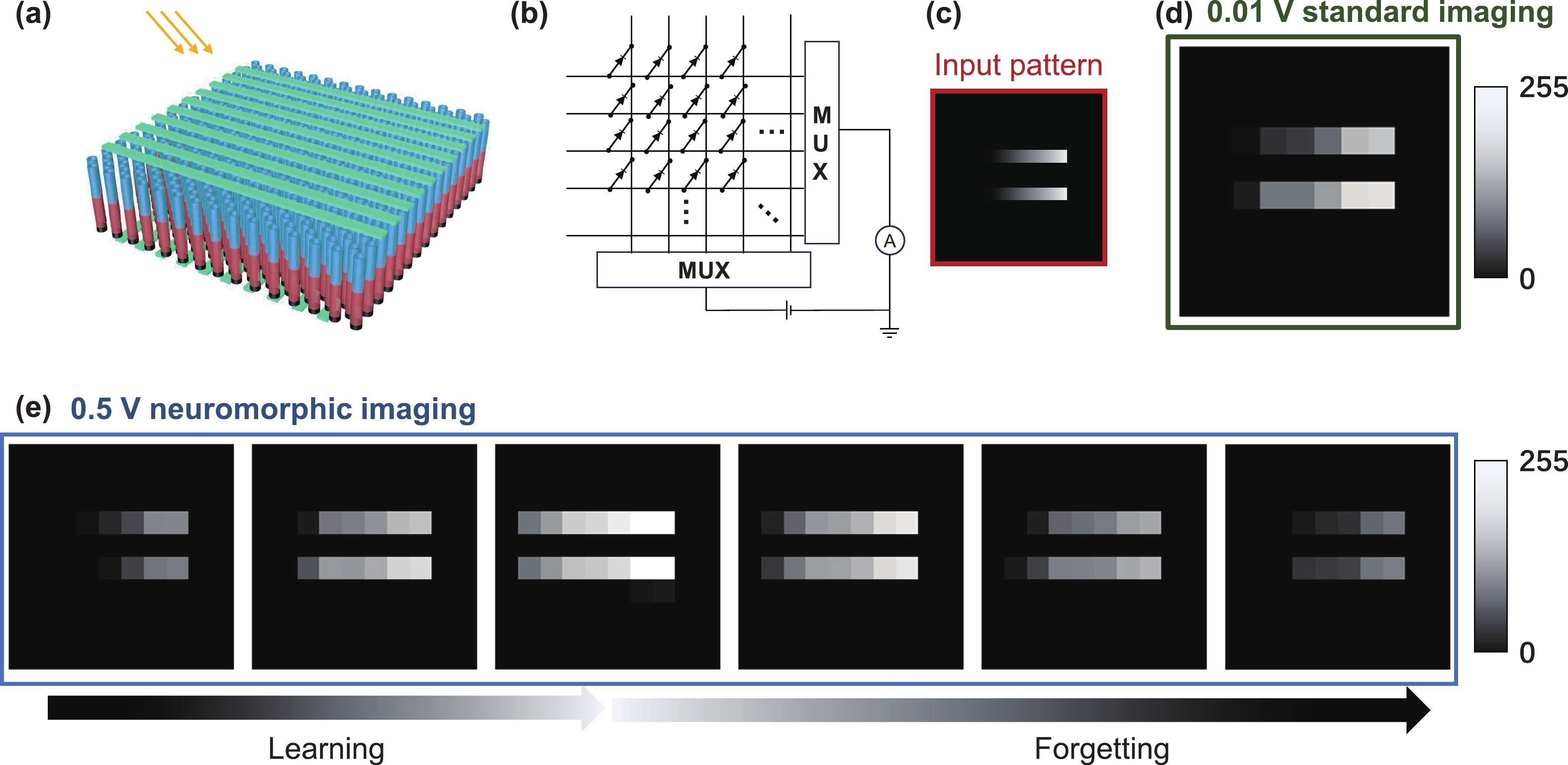 Abstract: The high-density, vertically aligned retinal neuron array provides effective vision, a feature we aim to replicate with electronic devices. However, the conventional complementary metal-oxide-semiconductor (CMOS) image sensor, based on separate designs for sensing, memory, and processing units, limits its integration density. Moreover, redundant signal communication significantly increases energy consumption. Current neuromorphic devices integrating sensing and signal processing show promise in various computer vision applications, but there is still a need for frame-based imaging with good compatibility. In this study, we developed a dual-mode image sensor based on a high-density all-inorganic perovskite nanowire array. The device can switch between frame-based standard imaging mode and neuromorphic imaging mode by applying different biases. This unique bias-dependent photo response is based on a well-designed energy band diagram. The biomimetic alignment of nanowires ensures the potential for high-resolution imaging. To further demonstrate the imaging ability, we conducted pattern reconstruction in both modes with a 10 × 10 crossbar device. This study introduces a novel image sensor with high compatibility and efficiency, suitable for various applications including computer vision, surveillance, and robotics.