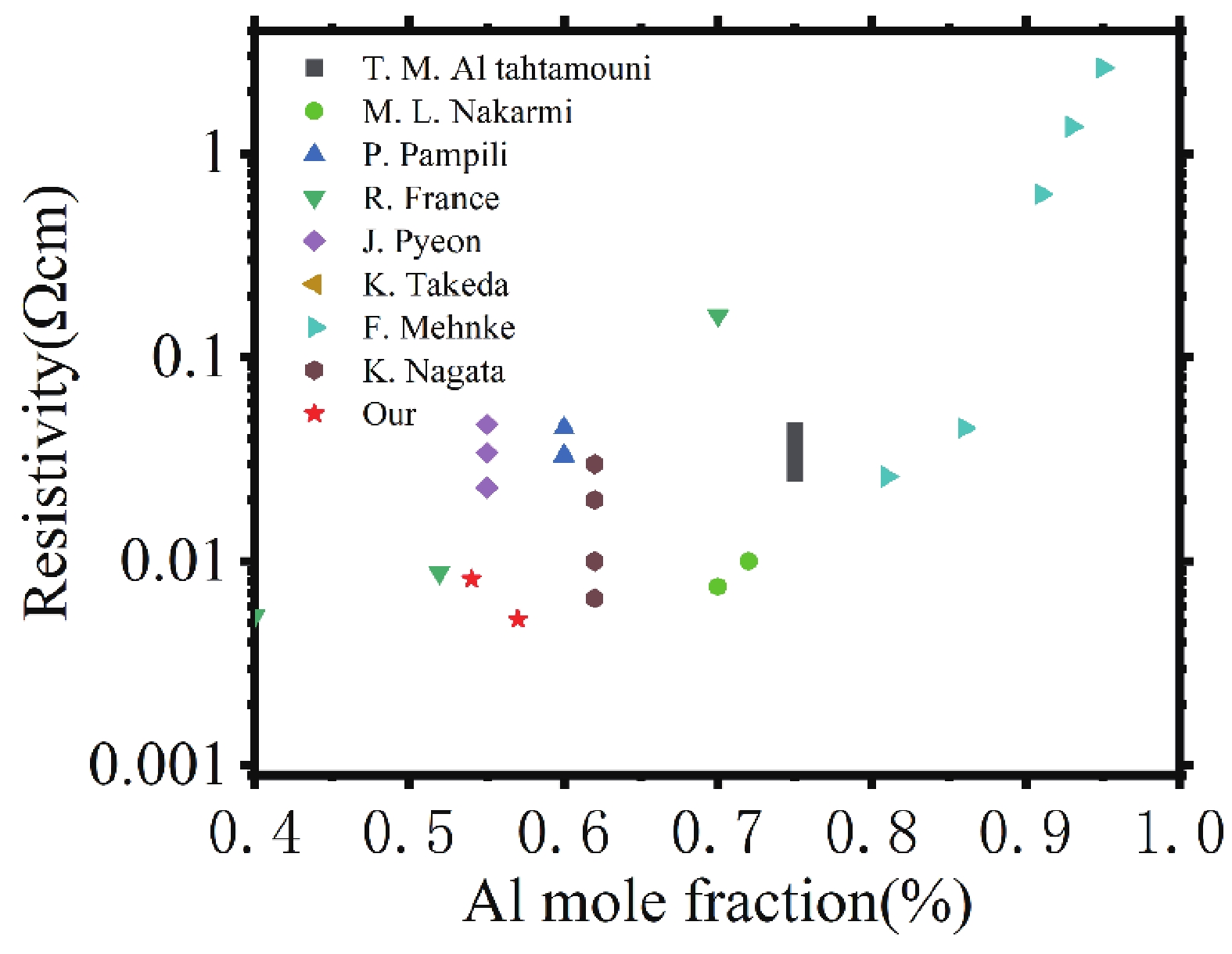 Yang J, Zhang Y H, Zhao D G, et al. Realization low resistivity of high AlN mole fraction Si-doped AlGaN by suppressing the formation native vacancies. J Cryst Growth, 2021, 570, 126245 doi: 10.1016/j.jcrysgro.2021.126245