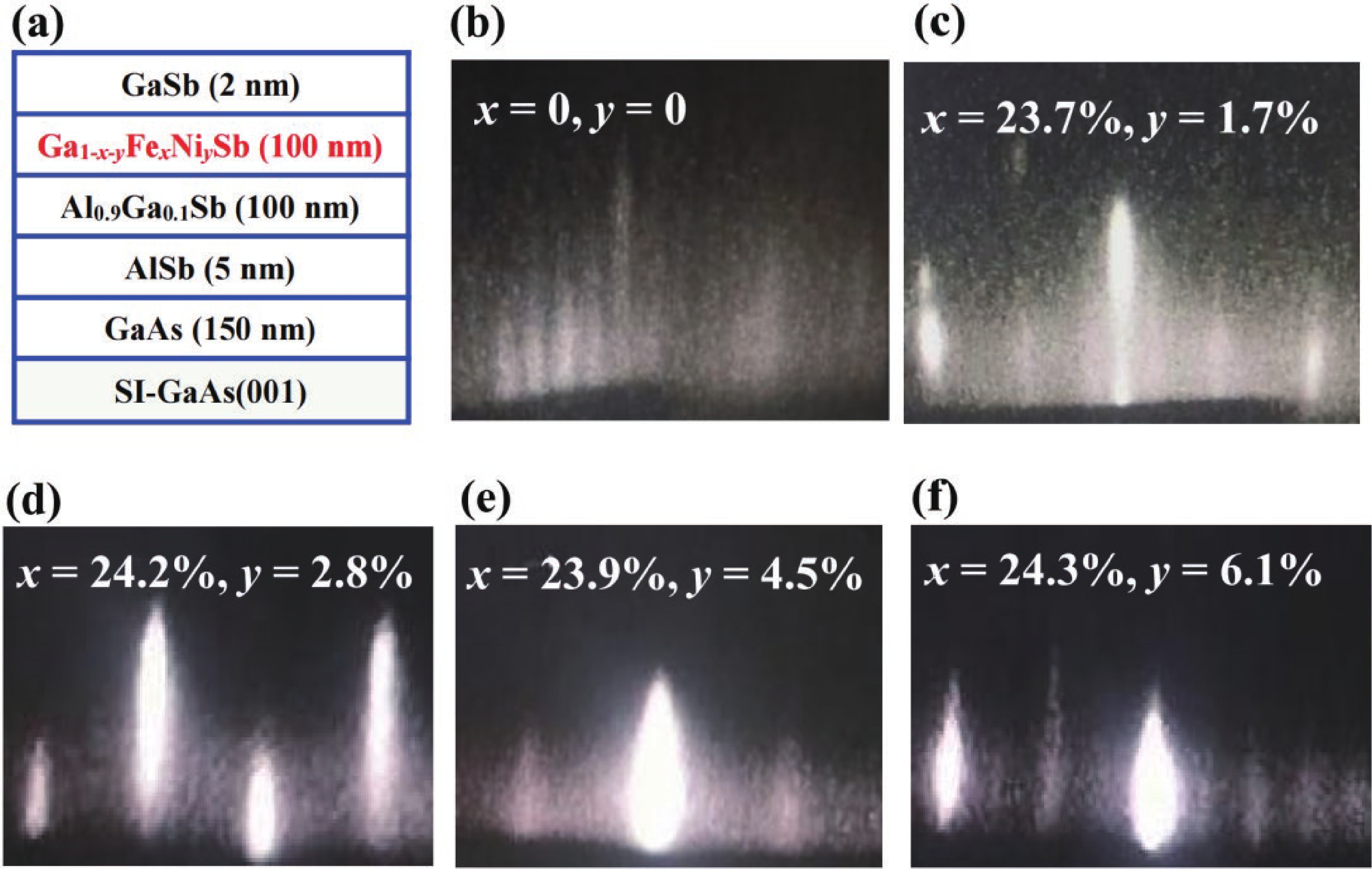 Table 1. Curie temperature TC, hole mobility μ at 10 K, saturation magnetization MS and anisotropy constant Ku of Ga1-x-yFexNiySb films with different Fe concentration x and Ni concentration y.