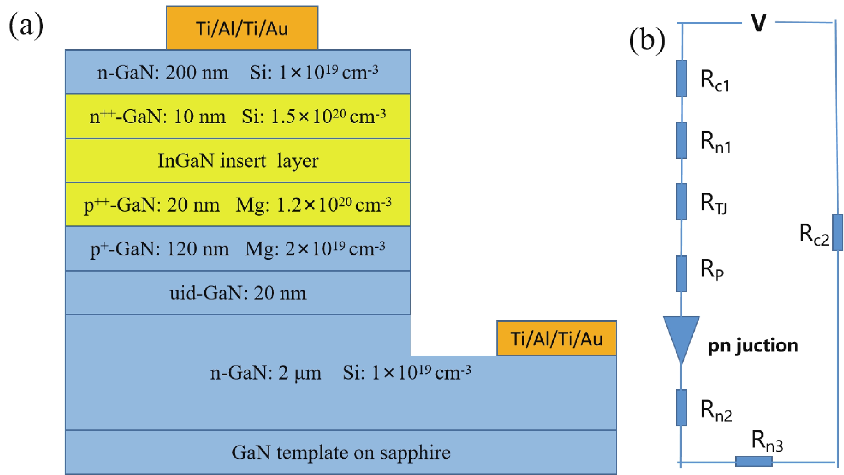 | p++-GaN: 20 nm (1020 cm?3) | Insert layer InGaN | n++-GaN: 10 nm (1020 cm?3) | |