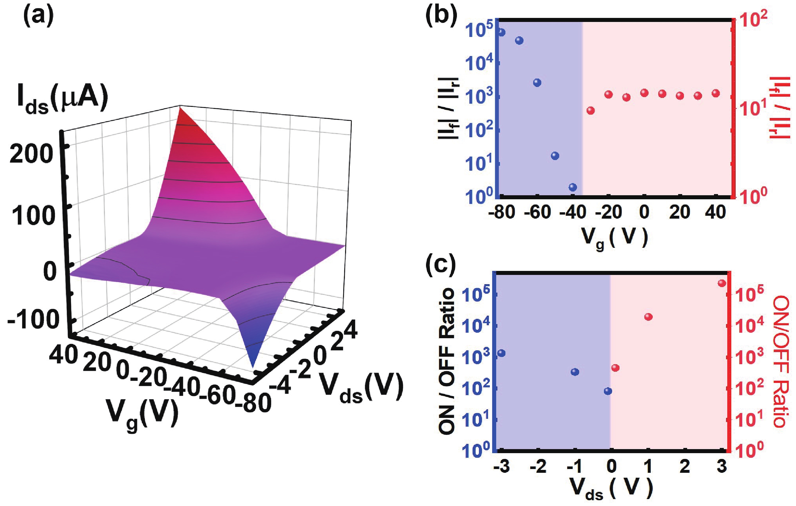 Abstract: Two-dimensional (2D) WSe2 has received increasing attention due to its unique optical properties and bipolar behavior. Several WSe2-based heterojunctions exhibit bidirectional rectification characteristics, but most devices have a lower rectification ratio. In this work, the Bi2O2Se/WSe2 heterojunction prepared by us has a type Ⅱ band alignment, which can vastly suppress the channel current through the interface barrier so that the Bi2O2Se/WSe2 heterojunction device has a large rectification ratio of about 105. Meanwhile, under different gate voltage modulation, the current on/off ratio of the device changes by nearly five orders of magnitude, and the maximum current on/off ratio is expected to be achieved 106. The photocurrent measurement reveals the behavior of recombination and space charge confinement, further verifying the bidirectional rectification behavior of heterojunctions, and it also exhibits excellent performance in light response. In the future, Bi2O2Se/WSe2 heterojunction field-effect transistors have great potential to reduce the volume of integrated circuits as a bidirectional controlled switching device.
