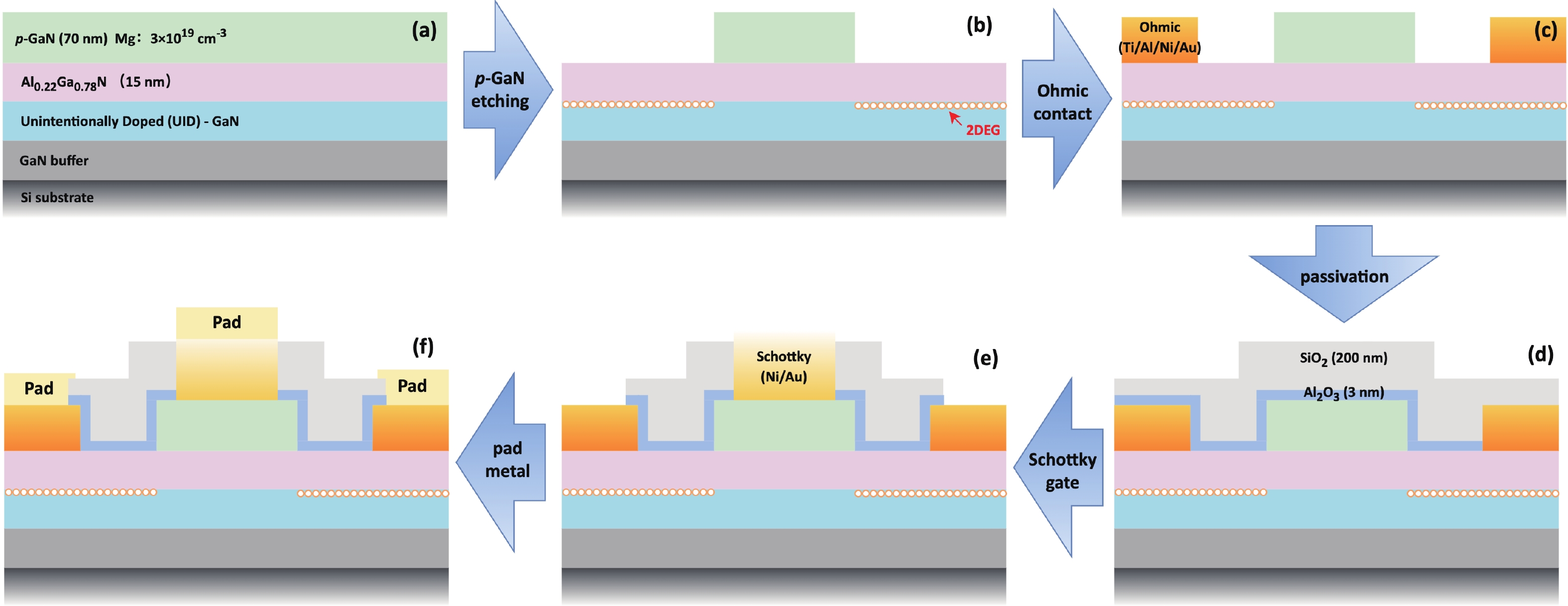 Fig. 1.  (Color online) Schematic diagram of the process flow of the Schottky-type p-GaN HEMT.