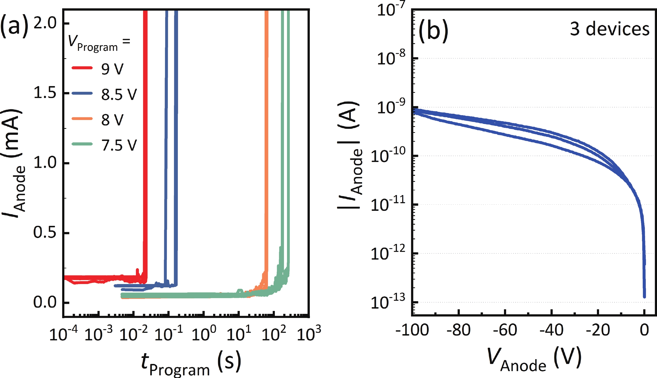 Fig. 5.  (Color online) (a) Program time under different program voltages (three devices each) . (b) Breakdown characteristics of the PIN junction of the p-GaN diode.