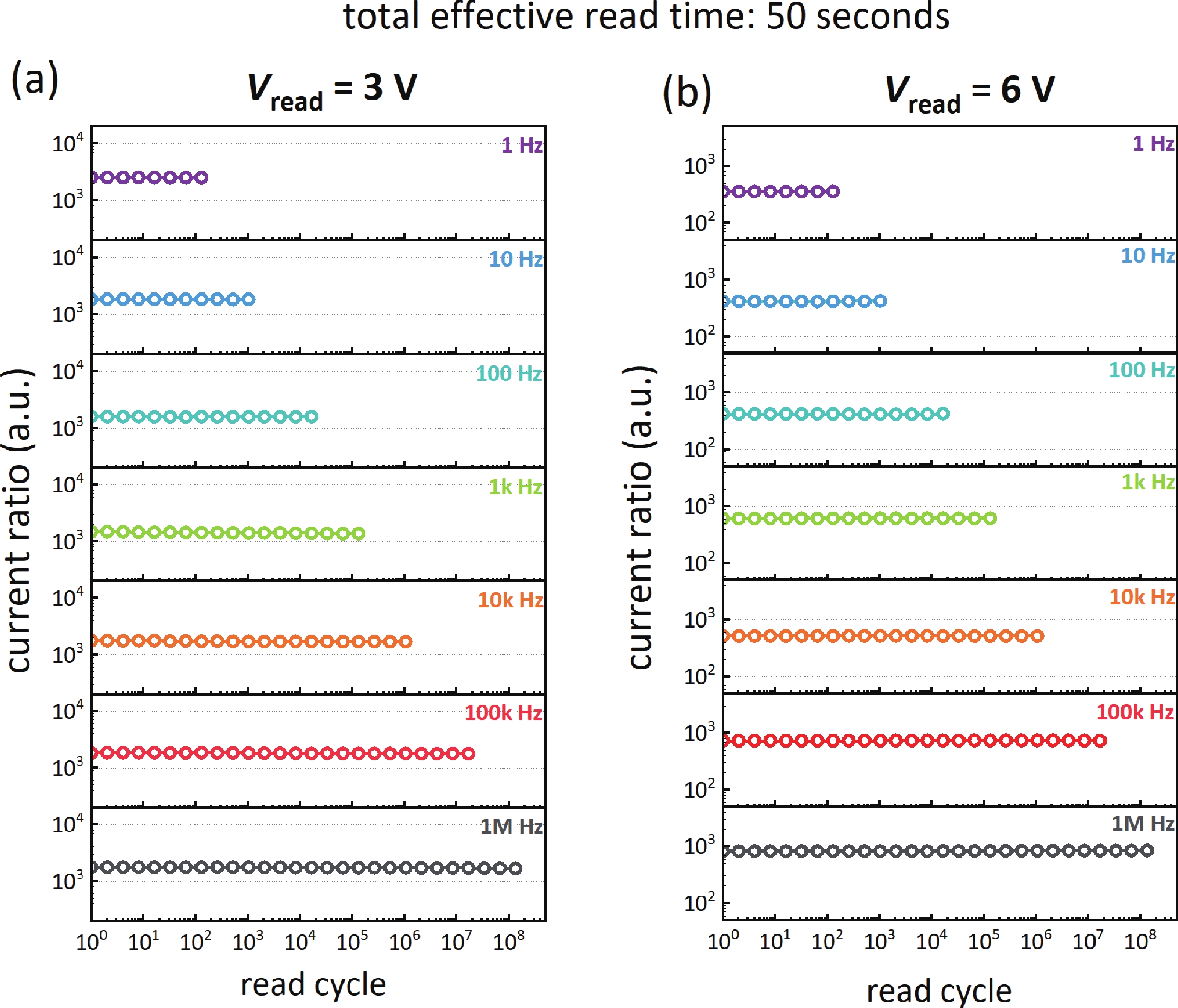 Fig. 6.  (Color online) Current ratio after different read cycles at a read voltage of 3 V (a) and 6 V (b). Pulse frequency: 1 Hz to 1 MHz, pulse duty cycle: 50%.