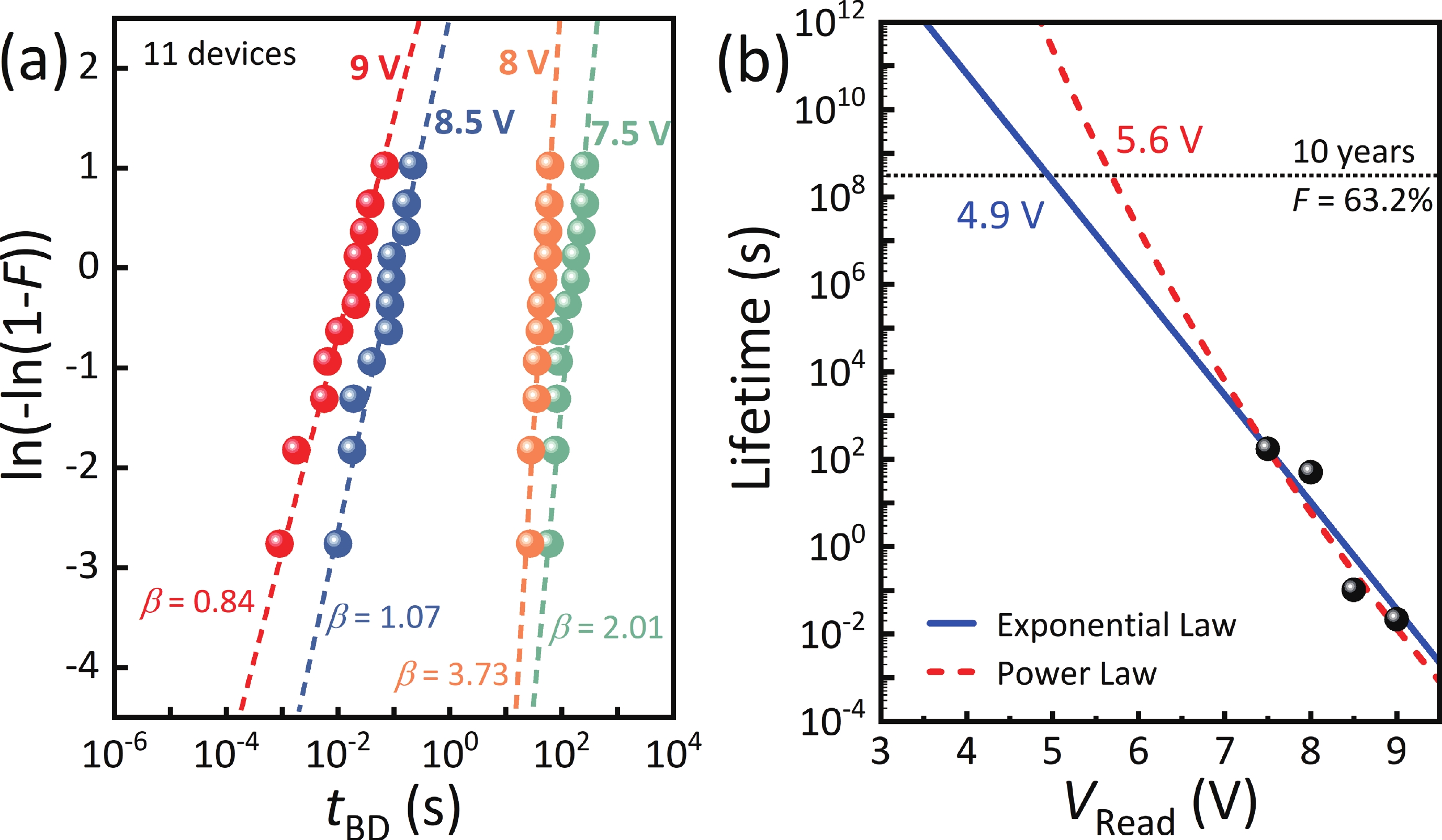 Fig. 7.  (Color online) (a) Weibull distribution of the breakdown time of the Schottky junction in the p-GaN diode. (b)Reverse bias voltages for a 10-year lifetime extracted from exponential and power laws at a 63.2% failure rate.
