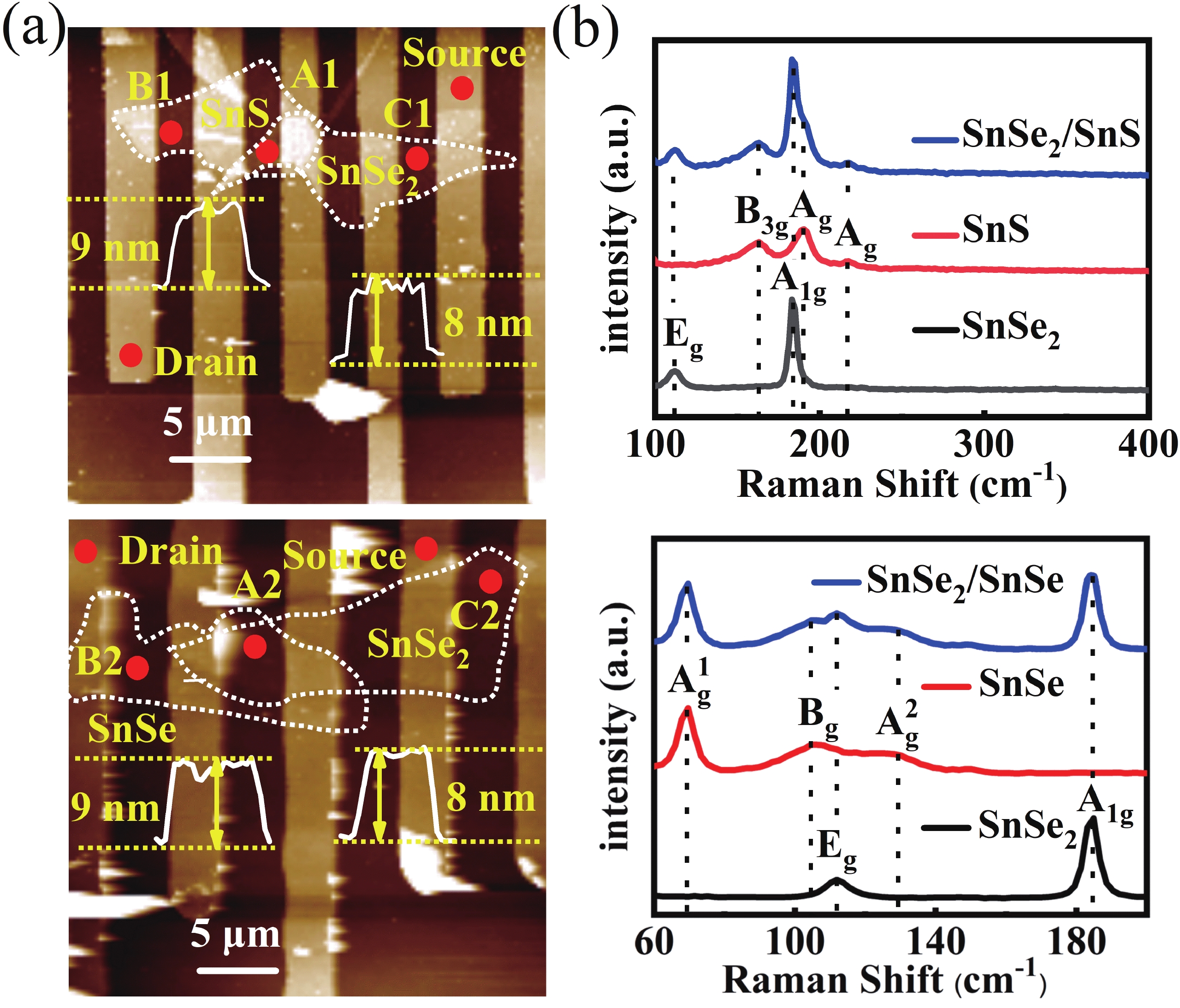 Abstract: The emergent two-dimensional (2D) material, tin diselenide (SnSe2), has garnered significant consideration for its potential in image capturing systems, optical communication, and optoelectronic memory. Nevertheless, SnSe2-based photodetection faces obstacles, including slow response speed and low normalized detectivity. In this work, photodetectors based on SnS/SnSe2 and SnSe/SnSe2 p?n heterostructures have been implemented through a polydimethylsiloxane (PDMS)?assisted transfer method. These photodetectors demonstrate broad-spectrum photoresponse within the 405 to 850 nm wavelength range. The photodetector based on the SnS/SnSe2 heterostructure exhibits a significant responsivity of 4.99 × 103 A?W?1, normalized detectivity of 5.80 × 1012 cm?Hz1/2?W?1, and fast response time of 3.13 ms, respectively, owing to the built-in electric field. Meanwhile, the highest values of responsivity, normalized detectivity, and response time for the photodetector based on the SnSe/SnSe2 heterostructure are 5.91 × 103 A?W?1, 7.03 × 1012 cm?Hz1/2?W?1, and 4.74 ms, respectively. And their photodetection performances transcend those of photodetectors based on individual SnSe2, SnS, SnSe, and other commonly used 2D materials. Our work has demonstrated an effective strategy to improve the performance of SnSe2-based photodetectors and paves the way for their future commercialization.