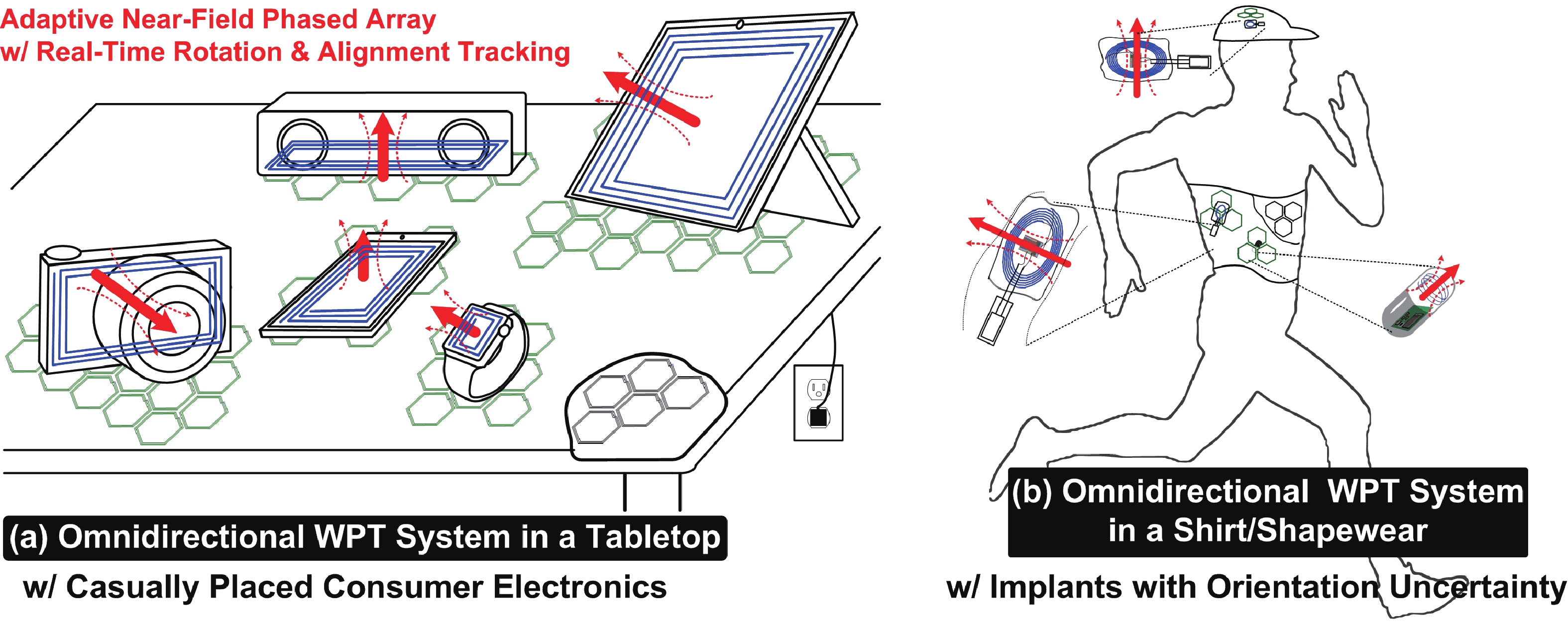 (Color online) 3D WPT in a 2D surface: (a) a desktop with delivering power to casually placed consumer elec-tronics; (b) a shapewear/hat delivering power to implants or capsules with orientation and position uncertainty.