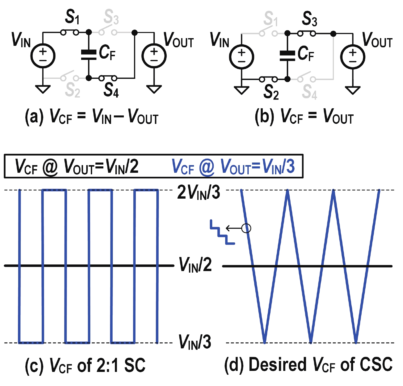 Fig. 1.  (Color online) (a) Charging and (b) discharging phases of a 2 : 1 SC converter, (c) VCF waveforms of 2 : 1 SC converter when VOUT = VIN/2 and VIN/3, and (d) desired VCF waveform of a CSC.