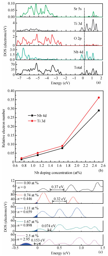 The n-type Nb-doped SrTiO3 with different doping concentrations were studied by first principles calculations. The effects of Nb concentration on the formation enthalpy, electronic structure and optical property were investigated. Results show that Nb preferentially enters the Ti site in SrTiO3, which is in good agreement with the experimental observation. The Fermi level of Nb-doped SrTiO3 moves into the bottom of the conduction band, and the system becomes an n-type semiconductor. The effect of Nb-doping concentration on the conductivity was discussed from the microscopic point of view. Furthermore, the 1.11 at% Nb-doped SrTiO3 shows strong absorption in the visible light and becomes a very useful material for photo-catalytic activity. The 1.67 at% and 2.5 at% Nb-doped models will be potential transparent conductive materials.