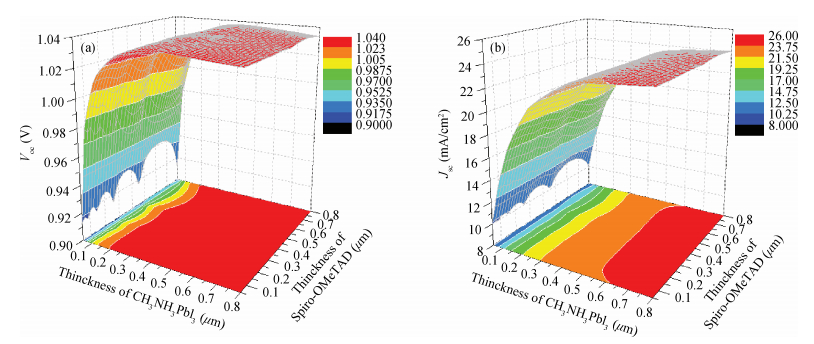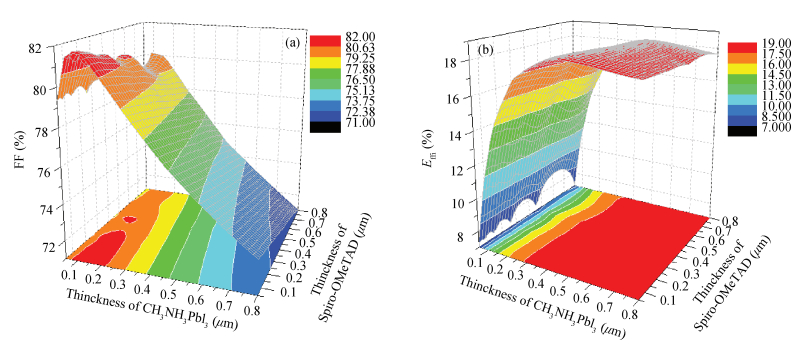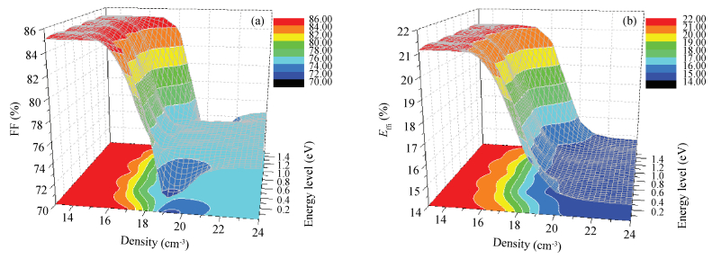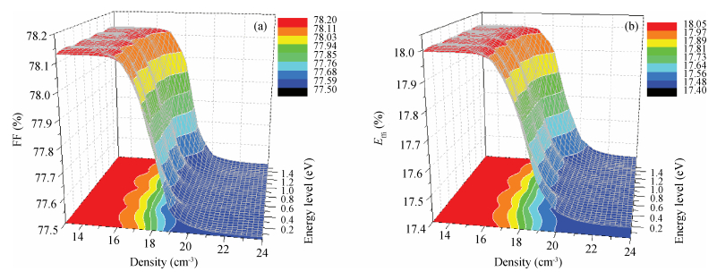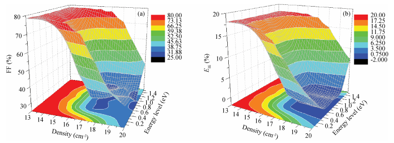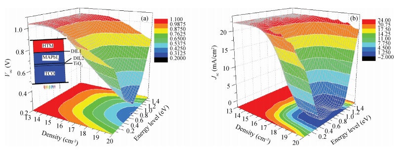 We built an ideal perovskite solar cell model and investigated the effects of defect states on the solar cell's performance. The verities of defect states with a different energy level in the band gap and those in the absorption layer CH3NH3PbI3 (MAPbI3), the interface between the buffer layer/MAPbI3, and the interface between the hole transport material (HTM) and MAPbI3, were studied. We have quantitatively analyzed these effects on perovskite solar cells' performance parameters. They are open-circuit voltage, short-circuit current, fill factor, and photoelectric conversion efficiency. We found that the performances of perovskite solar cells change worse with defect state density increasing, but when defect state density is lower than 1016 cm-3, the effects are small. Defect states in the absorption layer have much larger effects than those in the adjacent interface layers. The perovskite solar cells have better performance as its working temperature is reduced. When the thickness of MAPbI3 is about 0.3 μm, perovskite solar cells show better comprehensive performance, while the thickness 0.05 μm for Spiro-OMeTAD is enough.